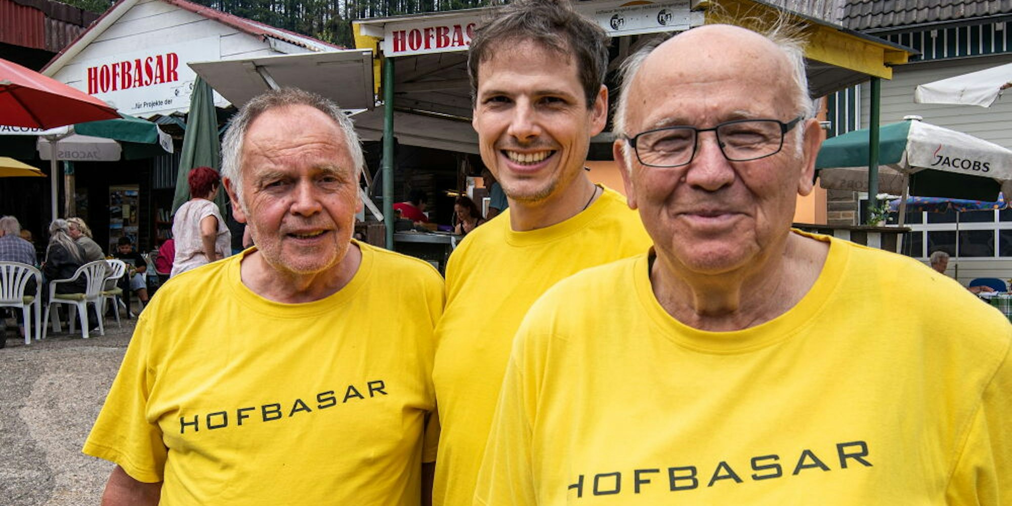 Der Hofbasar in Bengelshagen, das Foto zeigt Bruno Steinbach (r.) und andere Ehrenamtler.