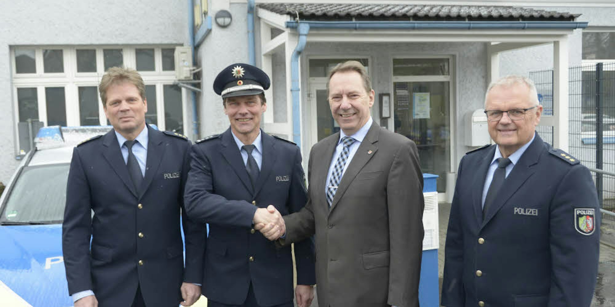 Landrat Jochen Hagt (3.v.r.) stellte den neuen Leiter der Wache Wipperfürth, Uwe Elias (2.v.r.) mit Polizeidirektor Sascha Himmel (l.) und Polizeidirektor Ralf Schmidt vor.