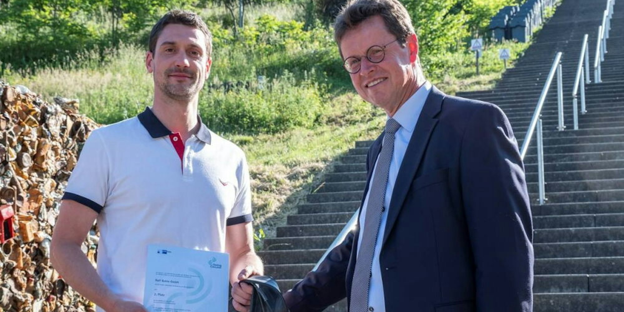Sebastian Bogdahn von Schwalbe nimmt von Jurymitglied Markus Müller-Drexel (r.) die Urkunde für Platz zwei entgegen.