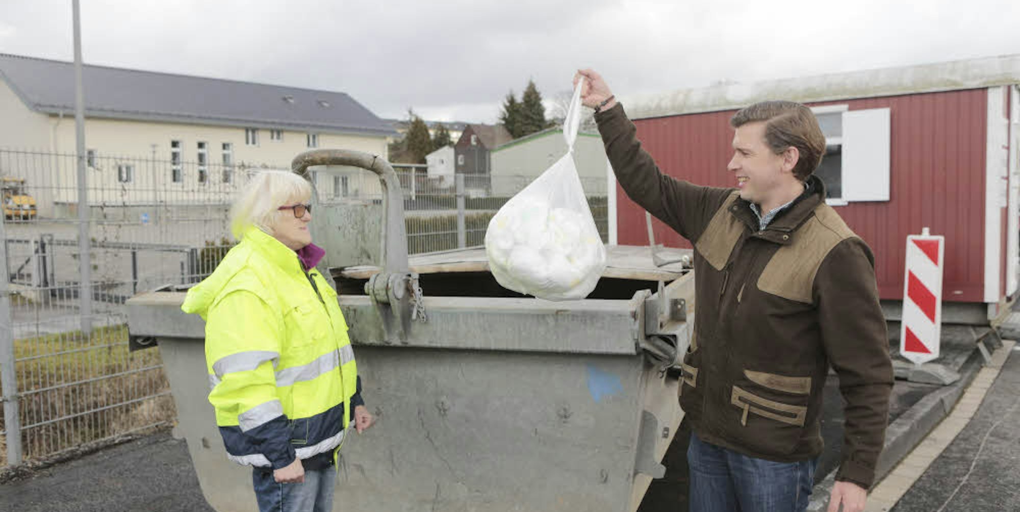 Windelentsorgung unter Aufsicht: Kai Ebert wirft einen Sack mit benutzten Windeln in den Container am Bauhof, Christel Knorr kontrolliert die Ausweise und führt Buch.
