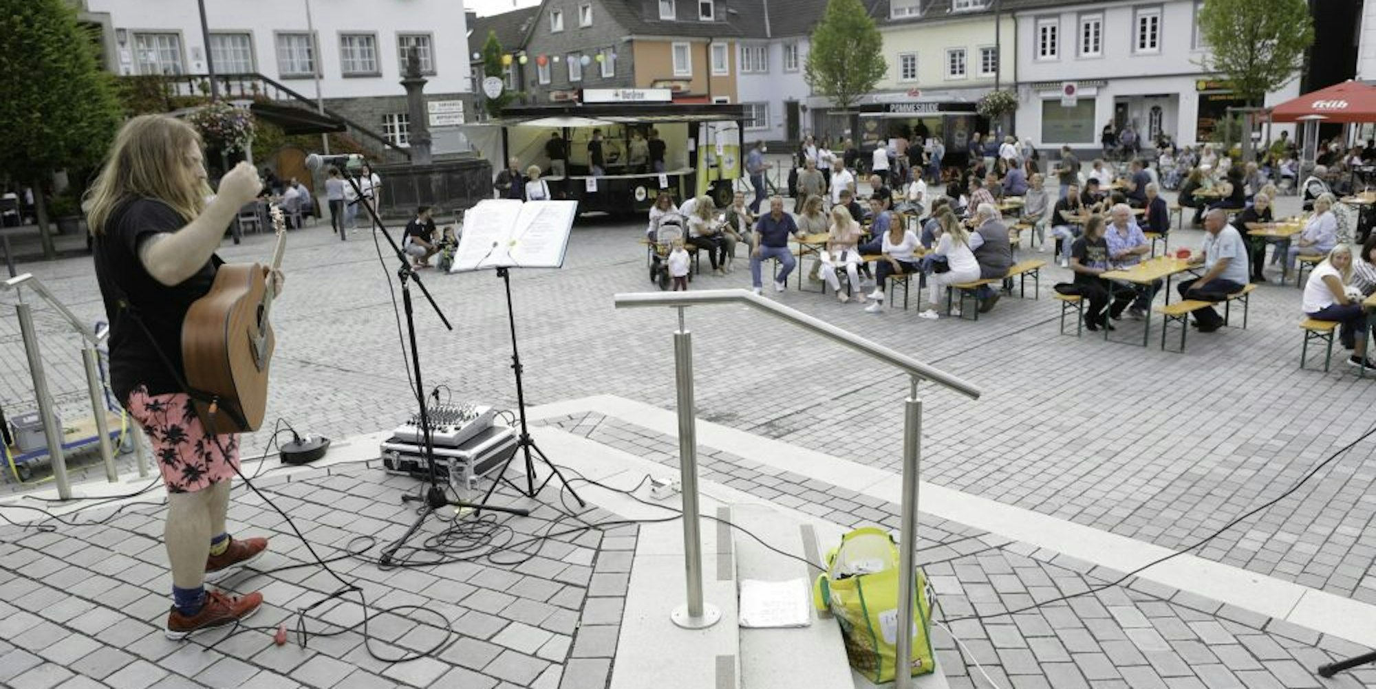 Wipperfürth – Einen Tag nach Inkrafttreten der neuen Corona-Schutzverordnung erlebt die Hansestadt eine Musiksommer-Auflage mit voll besetzten Zuschauerplätzen in den Biergärten. Die Menschen sind von dem Wunsch getrieben, bei warmen Temperaturen noch ein Stück vom bergischen Sommer aufzusaugen. Auf den ersten Blick weist am Samstagabend nichts darauf hin, dass nun das neue NRW-Regelwerk mit dem Spitznamen „3G-Regel“ gilt. Im Prinzip gibt es nur neue Hinweisschilder, die allerdings alle Gastronomen an ihren Eingangstüren befestigt haben.