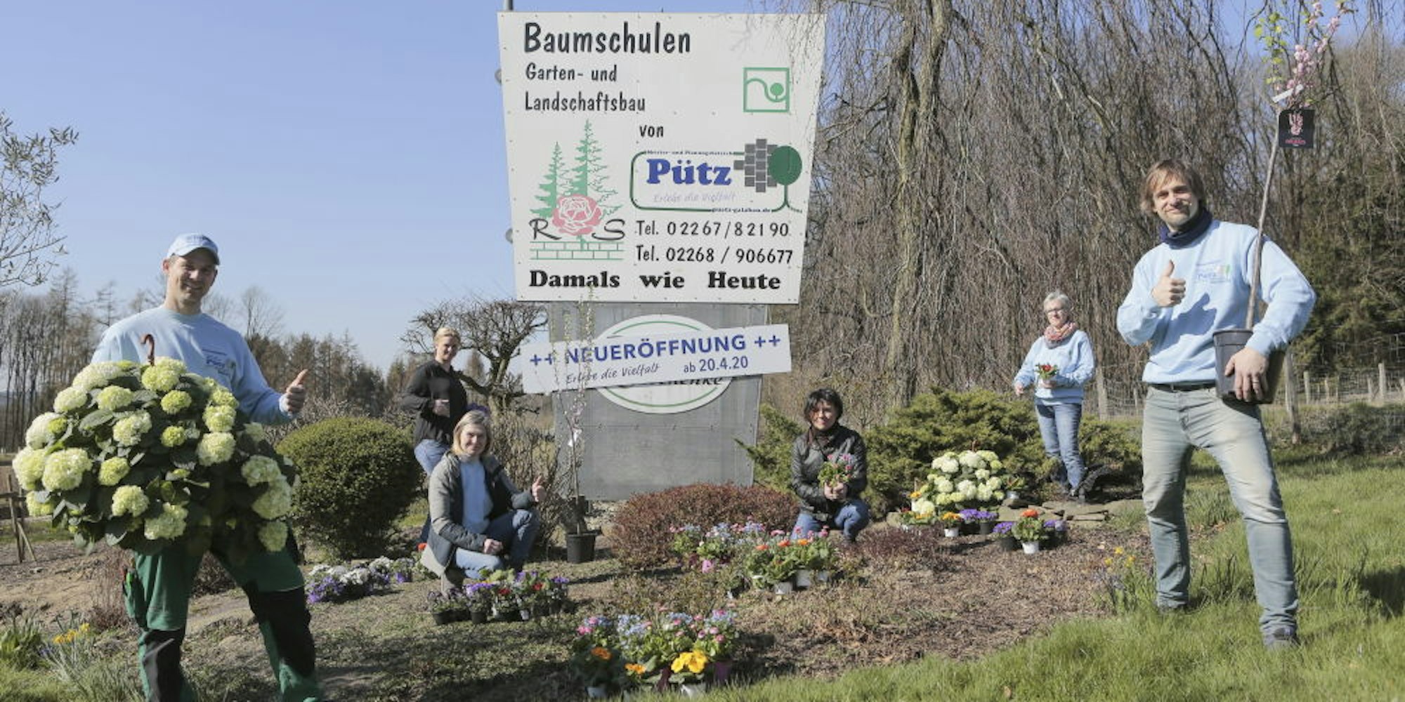 Sein Bruder sehe den Kauf in Zeiten der Corona-Krise nicht als Risiko, sondern als Chance: „Wir dürfen den Kopf als Unternehmer nicht hängen lassen. Wir müssen, wie der Begriff schon sagt, etwas unternehmen und ein positives Signal senden. Es ist eine Zeit der Neuanfänge“. „Damals wie heute“ heißt es auf dem alten Schild der Baumschule Schmitz neben der L284, auf dem nun auch der Name Pütz zu lesen ist. „Nicht nur beim Namensschild, sondern auch was alles andere angeht, wollen wir alte und bewehrte Elemente erhalten. Diese Baumschule ist ein Lebenswerk und das kann man nicht einfach ersetzen“, so Patrick Pütz. So wird es weiterhin einen Pflanzenverkauf geben und im Herbst wird das Unternehmen sich der Baumschule widmen. „Da wir im Landschaftsbau tätig sind, werden wir darüber hinaus hochwertige Materialien, wie Holz, Schrauben und Beleuchtung zum Verkauf anbieten“, berichtet René Pütz. Auch ein neuer Onlinehandel ist geplant. Nachhaltigkeit sei für die Brüder ein wichtiger Bestandteil ihrer Unternehmensführung und so werde man eine Solaranlage auf dem Dach installieren. Außerdem pflanze die Baumschule für jeden Baum, den sie wegen Krankheitsbefall fällen müssen, einen neuen.