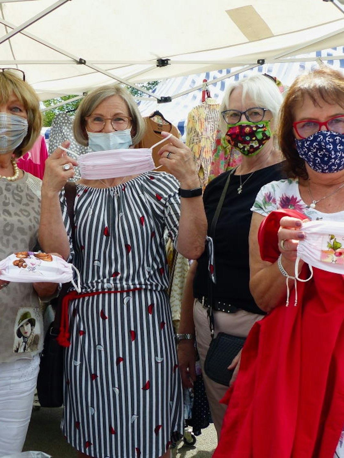 Einen Unterschied im Angebot zur Zeit vor Corona gibt es aber: Die Masken. Zum Beispiel am Stand von Karen Pickenpack. Hier stehen Monika Sonnenberg, Marlies Sesterhenn und Walburga Wolter. Die Freundinnen schauen sich gerade rosa und weiß gestreifte Masken mit verschiedenen Motiven an, die Pickenpack selbst genäht hat.