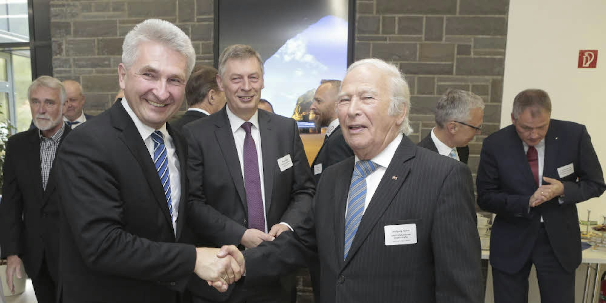 NRW-Wirtschaftsminister Andreas Pinkwart wird von Wolfgang Oehm (r.) begrüßt.