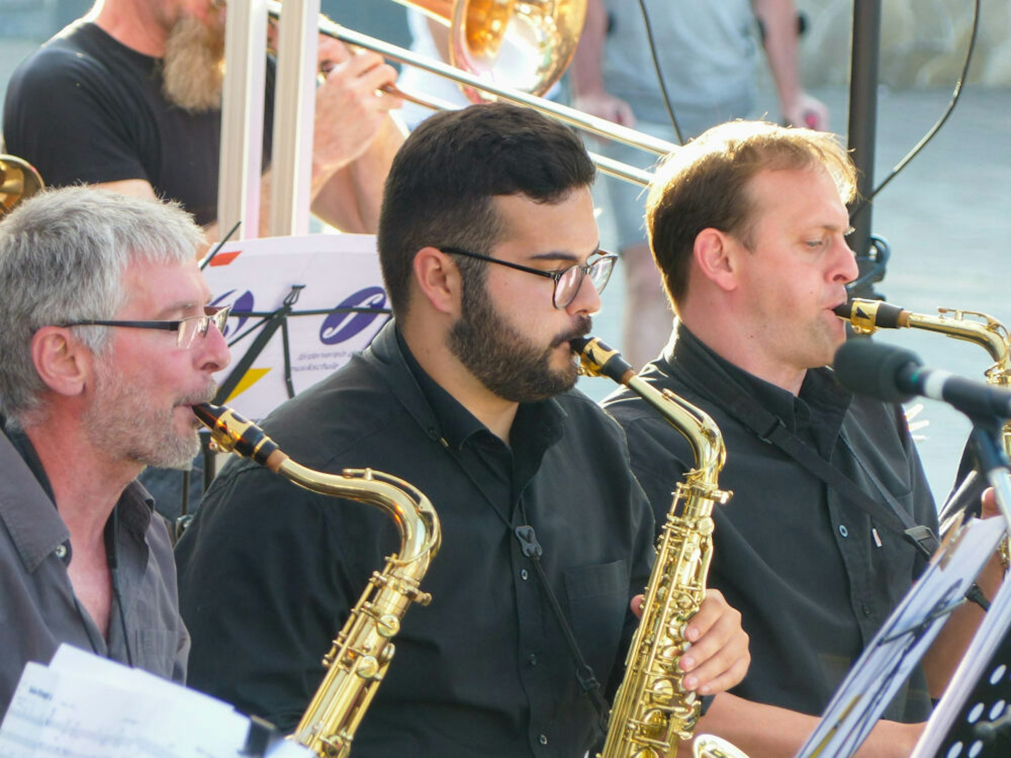 Auch die Schwestern Sabine Friedrichs und Gisela Schwermer sind begeistert von der Big Band. „Uns gefällt die Musik sehr gut. Wir sind extra mit dem Bus aus Lindlar hierhin gekommen, um das Konzert zu hören“, erzählt Schwermer. Besonders gut gefällt den Schwestern auch der Marktplatz als Location. Sowas in der Stadt zu haben, sei in ihren Augen nicht selbstverständlich. „Da wundert es einen schon ein wenig, dass am Abend nicht noch genau so viele Leute wie am Nachmittag da sind“, sagte Schwermer und schaute auf einige leere Sitzplätze.