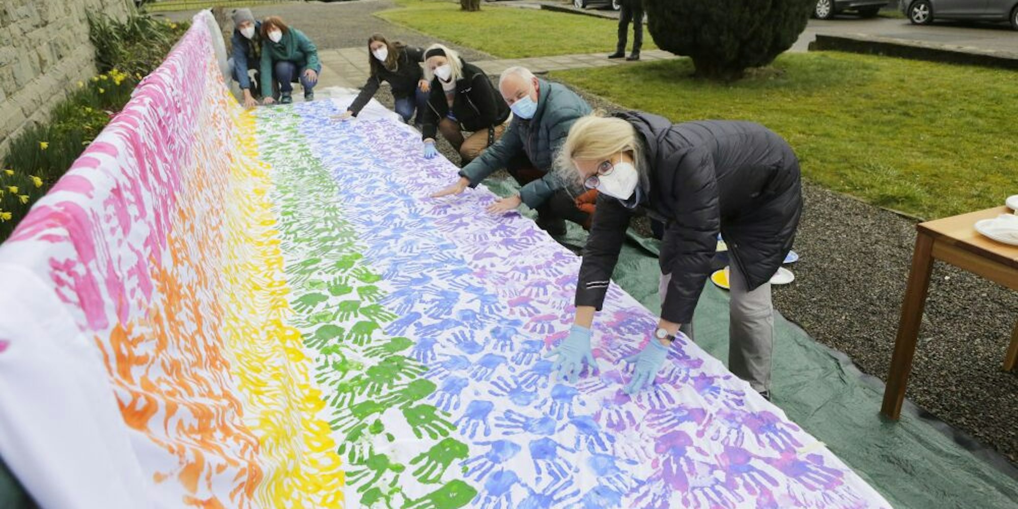 Vor und nach dem Gottesdienst hinterlassen sie bunte Handabdrücke auf der zweieinhalb mal siebeneinhalb Meter großen Flagge, die Jenny Renner aus mehreren Bettlaken genäht hat. „Die Abdrücke symbolisieren den persönlichen Protest und zeigen, dass unsere Kirche ein buntes Völkchen ist“, so die Sünger. Die bunten Handzeichen sollen nun noch gebügelt werden, um sie regenfest zu machen.