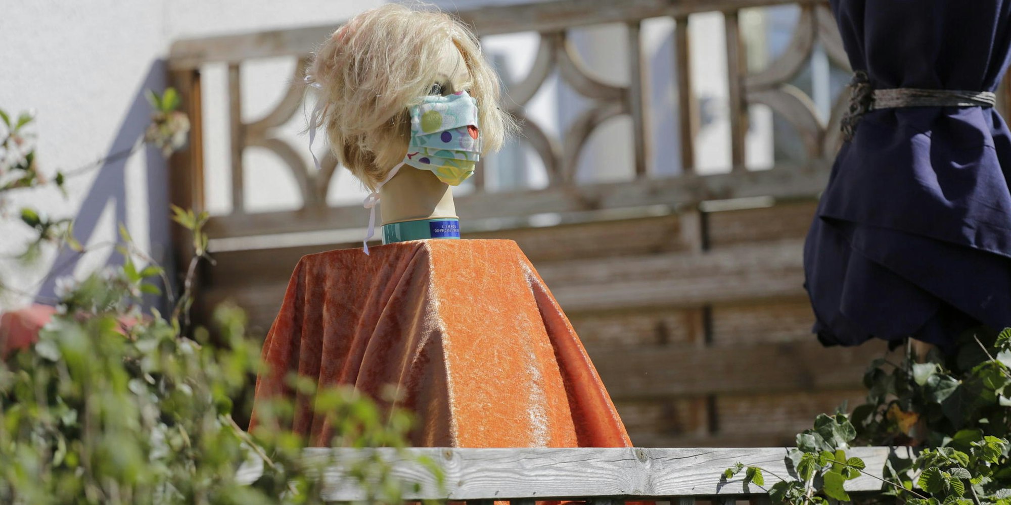Eine Puppe mit Mundschutz am Siebenborn weist den Weg zu Haus Nummer 78, wo Sabine Häger jeden Tag eine Box mit selbstgenähten Masken aufstellt.