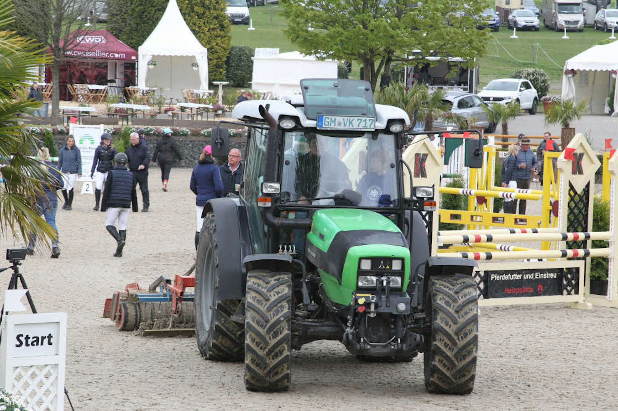 Von den 100 Mitgliedern des Vereins, 30 davon sind Jugendliche, sind an den Tagen des Turniers fast alle im Einsatz. Vorsitzender Stefan Laart ist der Herr der Durchsagen. Geduldig sitzt er in seiner Bude und kündigt die Pferde und Reiter an. In den Pausen vertritt er sich draußen die Beine. „Ohne die ganzen Ehrenamtler wäre das nicht zu schaffen“, sagt er. Judith Moos fährt derweil mit dem Trecker durchs Geviert und sorgt für die frische Einebnung des Untergrunds. Uwe Börsch hat stets Zollstock und Schraubenzieher zur Hand. Er misst beim Umbau die richtigen Abstände zwischen den Hindernissen und ist ansonsten das Mädchen für alles. Ob Elektroanschlüsse oder Kabelverlegung, der 53-Jährige ist immer unterwegs.