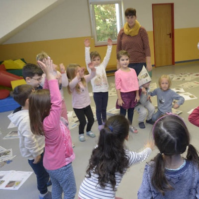 Neugierig begutachteten die Kinder anschließend die Ente und löcherten sie neugierig mit Fragen. So fanden sie zum Beispiel schnell heraus, dass Paula neben Schnecken auch gerne Spaghetti isst. Der ein oder andere fragte sich dagegen, ob Enten überhaupt Ohren haben, denn bei Paula entdeckten die Kinder keine. „Vielleicht sind die auch einfach nur gut versteckt“, meinte Michael Lenzen, der die Antworten der Zeitungsente, die nicht sprechen kann, für die Kinder übersetzte.