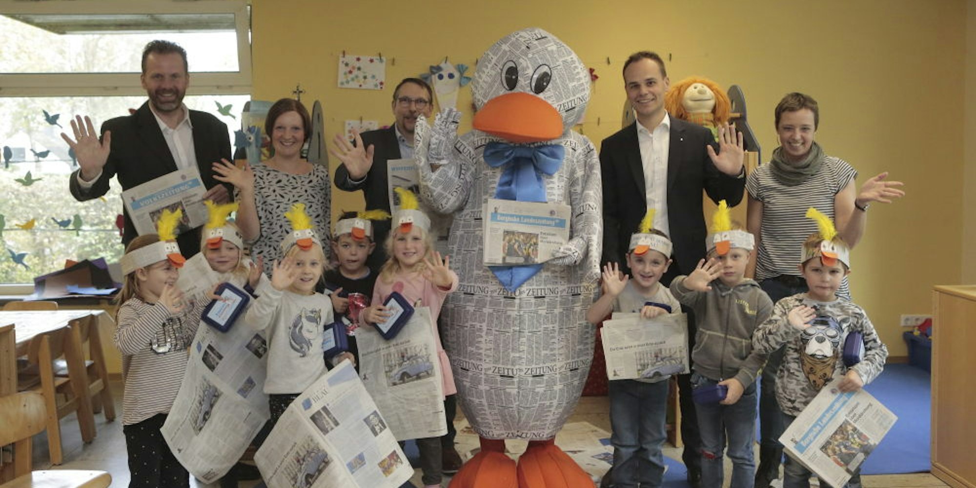 Thier – Aufgeregt warteten die Kinder der Katholischen Kindertagesstätte St. Anna in Thier gestern auf einen ganz besonderen Gast. Zeitungsente Paula Print, das Maskottchen des medienpädagogischen Projekts dieser Zeitung, hatte sich zum Auftakt der neuen Auflage von „BLZ und OVZ im Kindergarten“ angekündigt.
