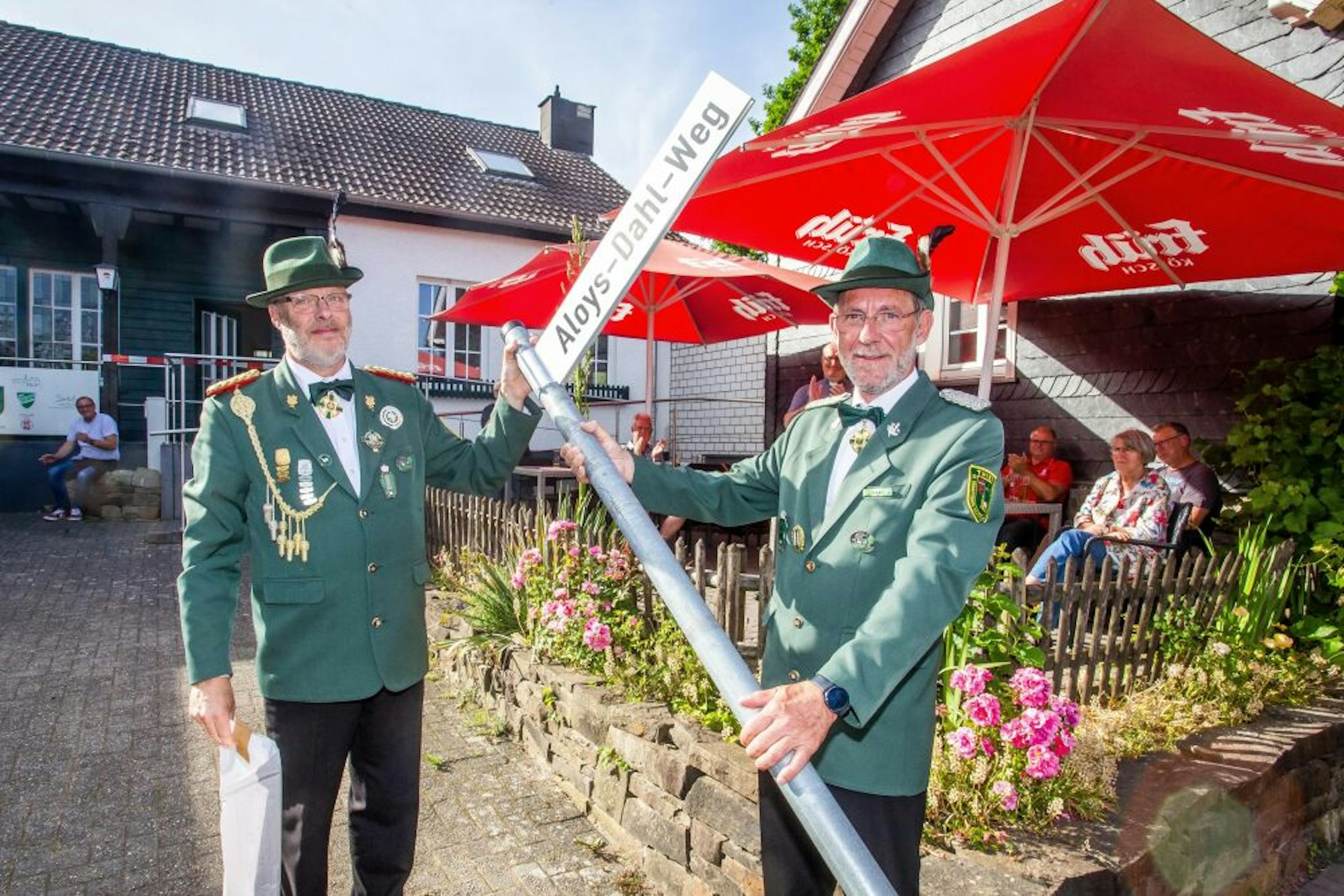 Berster und Fehling enthüllten zum Abschluss das offizielle Straßenschild. „Mit dem Aloys-Dahl-Weg erinnern wir an den Schützenbruder, der die treibende Kraft war und immer wieder eine stufenlose Verbindung zwischen Kirche und Dorfgemeinschaftshaus ins Gespräch gebracht hat“, so Berster. Mit der Installation einer Beleuchtung soll dann alles fertig sein.
