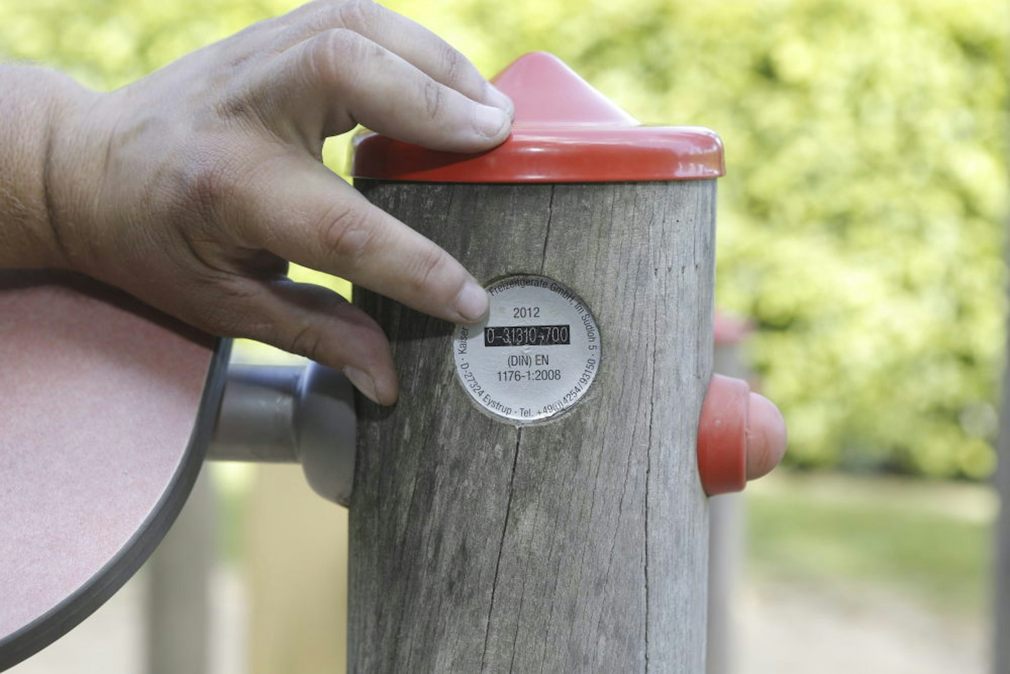 Geprüft wird auch der Fallschutzbelag, also das, worauf das Kind fällt, wenn es fällt. Das kann Sand sein oder Kies, in diesem Fall ist es Rasen und der ist verschlissen von rutschenden Kinderfüßen und muss erneuert werden. Das ist dann aber auch schon der einzige Mangel, den Martin Bayer auf den Ohler Wiesen festgestellt hat, nachdem er mit vollem Körpereinsatz an Wippen gerüttelt und Holzpfosten von Klettertürmen mit dem Griff seines Schraubenziehers abgeklopft hat.