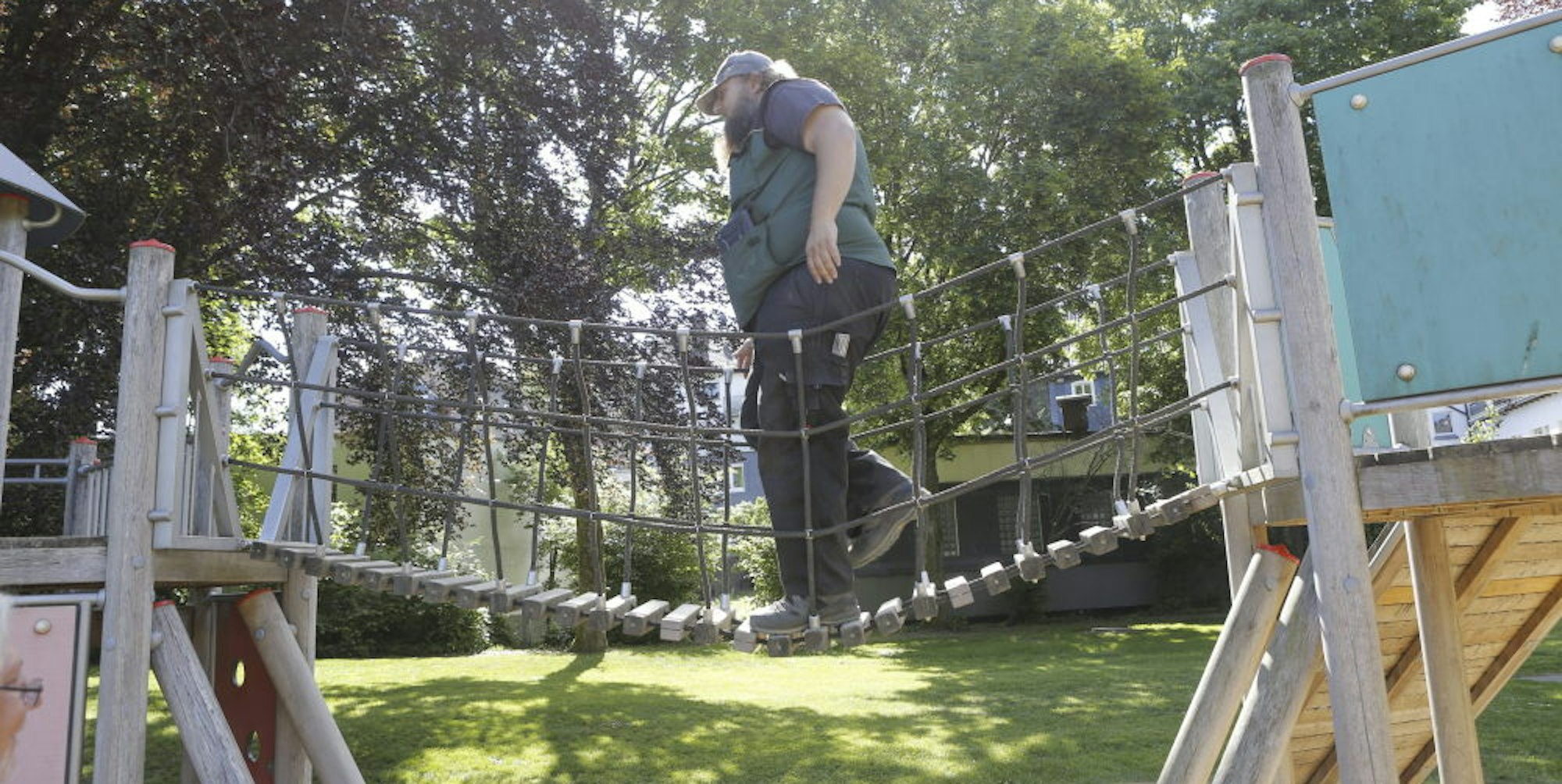 „Oft sieht man Schäden am Holz gar nicht, aber man hört es deutlich, wenn innen etwas faul ist“, erklärt der Mann mit dem Rauschebart. Also alles tipptopp hier, bis auf die Sache mit dem Rasen. Und den Verschleiß der Kette muss man im Auge behalten. Selbstverständlich ist das nicht, Bayer berichtet von Kommunen, die ihre Spielanlagen regelrecht verwahrlosen lassen. Aber Wipperfürth hat sich nichts vorzuwerfen, so attestiert er, die hiesigen Spielplätze gehören definitiv zu den besten zehn Prozent in ganz Deutschland.