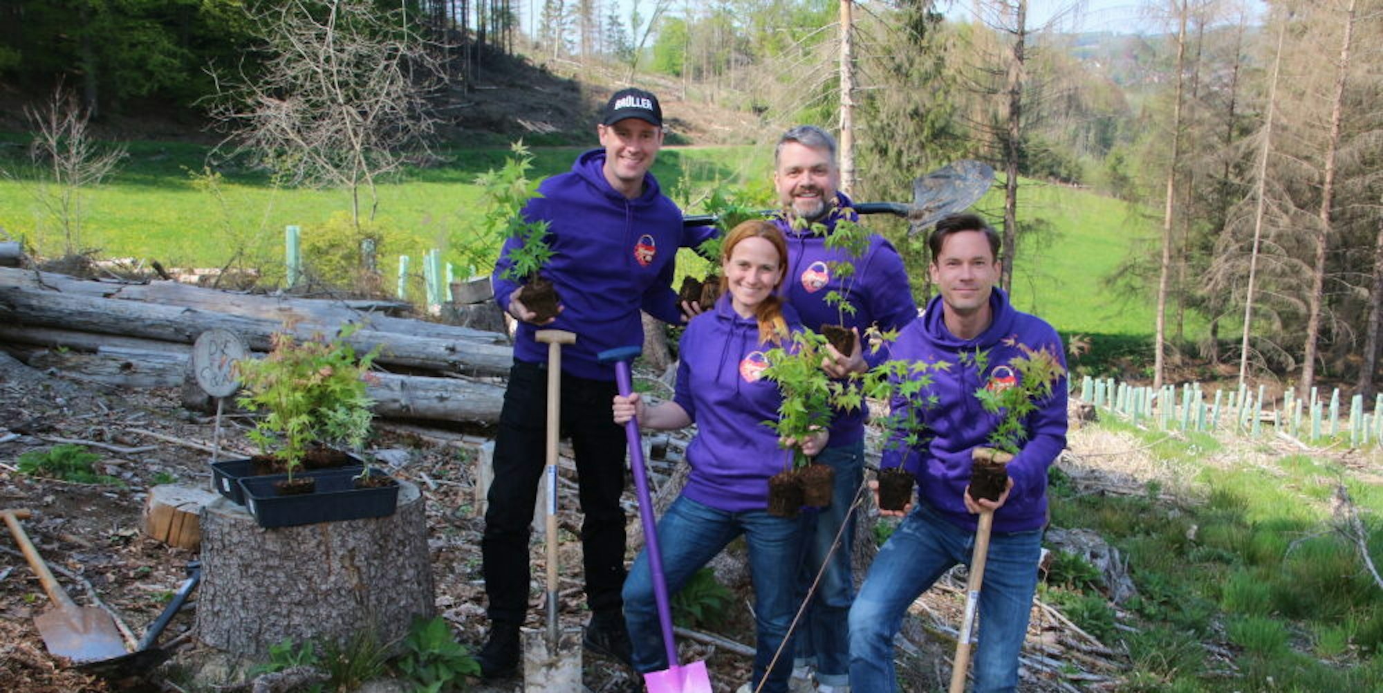 Rund 50 neue Bäume pflanzten Markus Schneider, Enrico De Pieri, Vera Bolten und Martin Planz auf einem Gebiet, das das Umweltschutzunternehmen „Forstfreunde“ nach dem Borkenkäferbefall mit vielen Unterstützern aufforstet. „Die 50 Bäume sind aber erst der Anfang“, verriet Renate Schmidt von der Öffentlichkeitsarbeit. Denn für jede Vorstellung von „Himmel und Kölle“ im in der Volksbühne am Rudolfplatz spendet Produzent Frank Blase elf Bäume fürs Projekt. „Seit September 2021 sind so rund 1500 Bäume bereits zusammengekommen,“ fasste es Renate Schmidt zusammen. Und das Engagement werde fortgesetzt, verspricht Frank Blase.