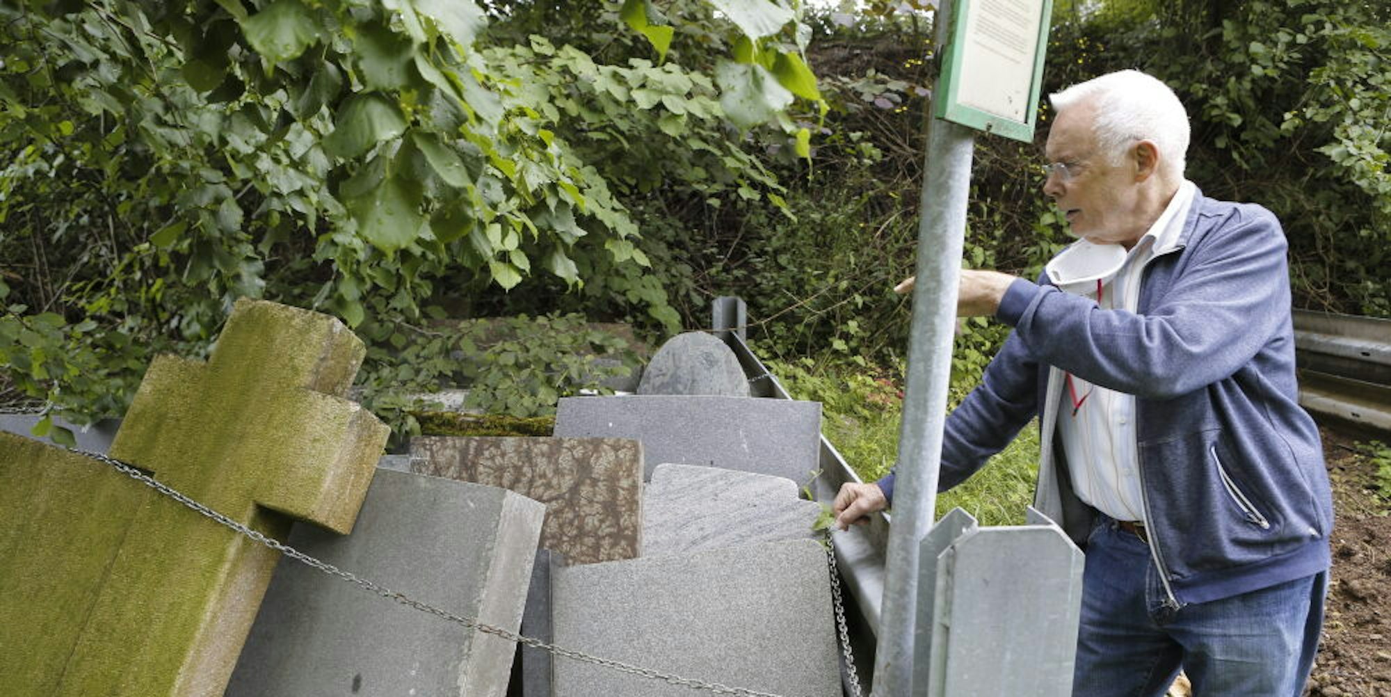 In der Nähe des Friedhofs sind noch 39 Grabmäler aus jüngerer Zeit gelagert, zeigt Werner Stefer hier (links). An der Kirche St. Clemens sind deutlich ältere Exponate hinter Gusseisengittern zu sehen.