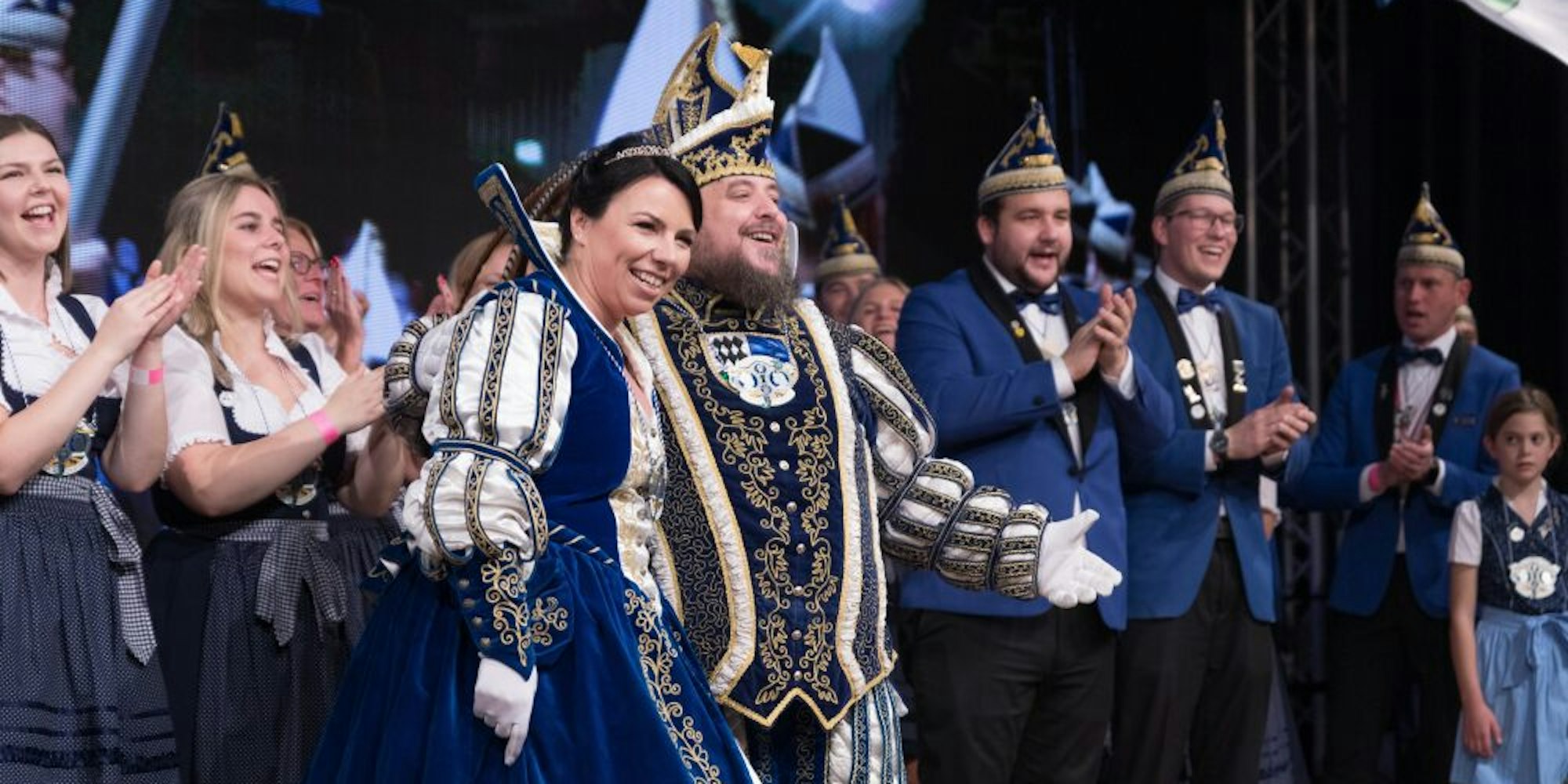 Und dann kommt der Höhepunkt des Abends: Die Proklamation von Prinz Bonsai und seiner Prinzessin Bianca. Mit bürgerlichen Namen hören sie auf Stephan und Bianca Berghaus. „Ihr könnt Euch gar nicht vorstellen, was das für ein tolles Gefühl ist, hier reinzuschreiten“, sagt Prinz Bonsai. Ein ganzes Jahr lang musste das Paar warten und freut sich, jetzt endlich auf der Bühne zu stehen. „Ich freu mich wirklich sehr, Euch so strahlen zu sehen“, sagt Wipperfürther Bürgermeisterin Anne Loth. Dann überreicht sie Zepter, Königskette und Blumen.