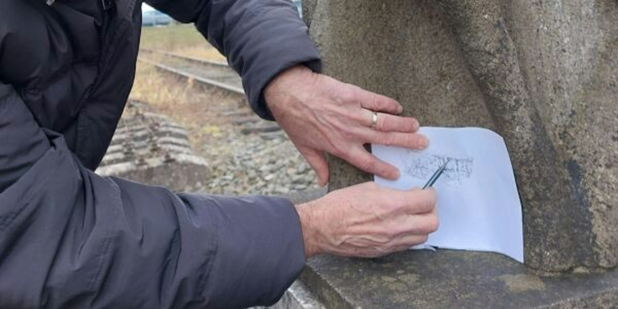 Mit Bleistift und Brutterbrotpapier machte Michael Wittschier den Namen des Künstlers sichtbar.