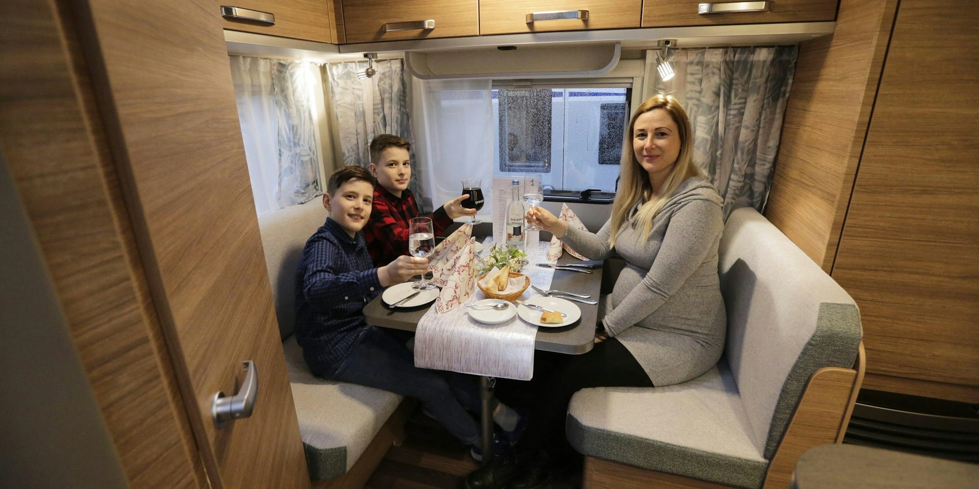 Ein ungewöhnlicher Ort für ein Dinner ist die Sitzecke im Wohnwagen.