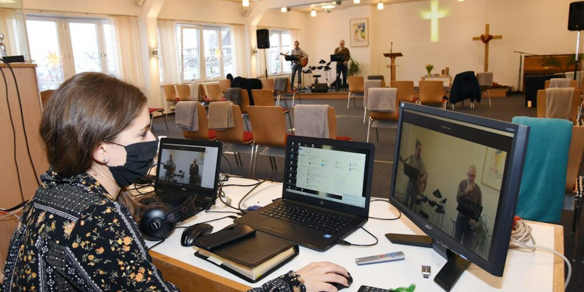 Livesendung der Mühlenberggemeinde: Astrid Knörk am Livestreamrechner und Manuel und Michael Vater im Musikteam.