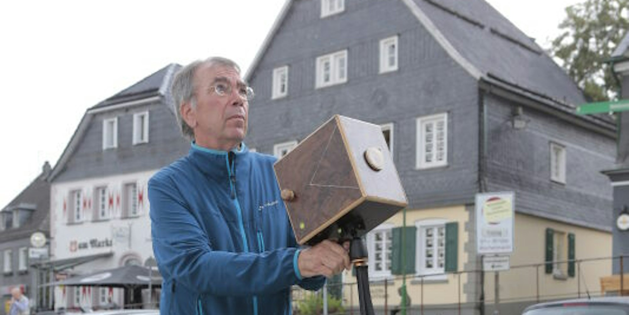 Michael Wittschier mit seiner selbstgebauten Lochkamera auf dem Marktplatz.