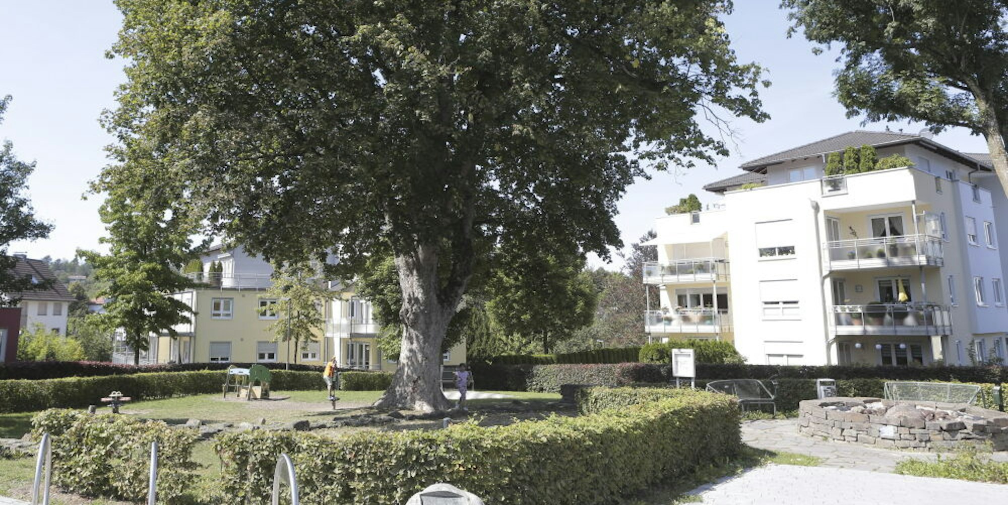 Die bestehende Bepflanzung, insbesondere die Bäume, sollen „in ihren Grundzügen“ erhalten bleiben. Die Hecke im Westen soll durch ein Staudenbeet und vier säulenförmige Sumpfeichen ersetzt werden. Am Wasserlauf sind ebenfalls Sumpfeichen vorgesehen, allerdings mit einer dachförmigen Krone, die Schatten spendet.