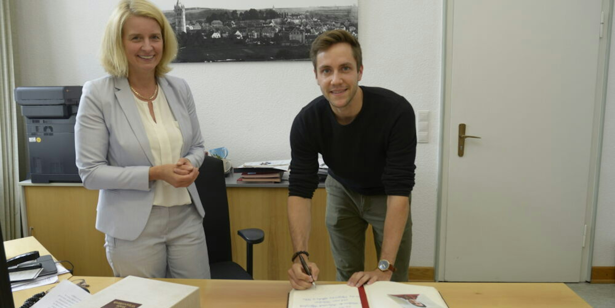 Mark Lamsfuß trägt sich ins Goldene Buch ein.