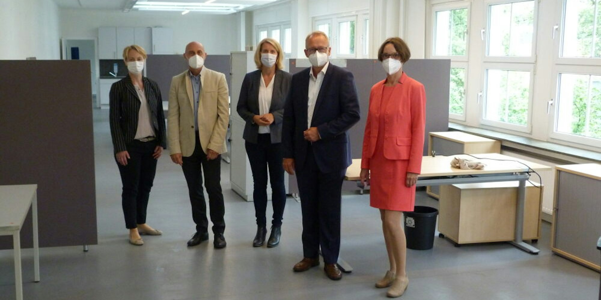 Ortsbesichtigung des Großraumbüros im 1. Stock mit Renate Brüning (Gebäudemanagement), Jörn Krieger (Radium-Geschäftsführer), Bürgermeisterin Anne Loth, Markus Gosse (Radium) und Leslie Kamphuis (Stadt Wipperfürth (v.r.).