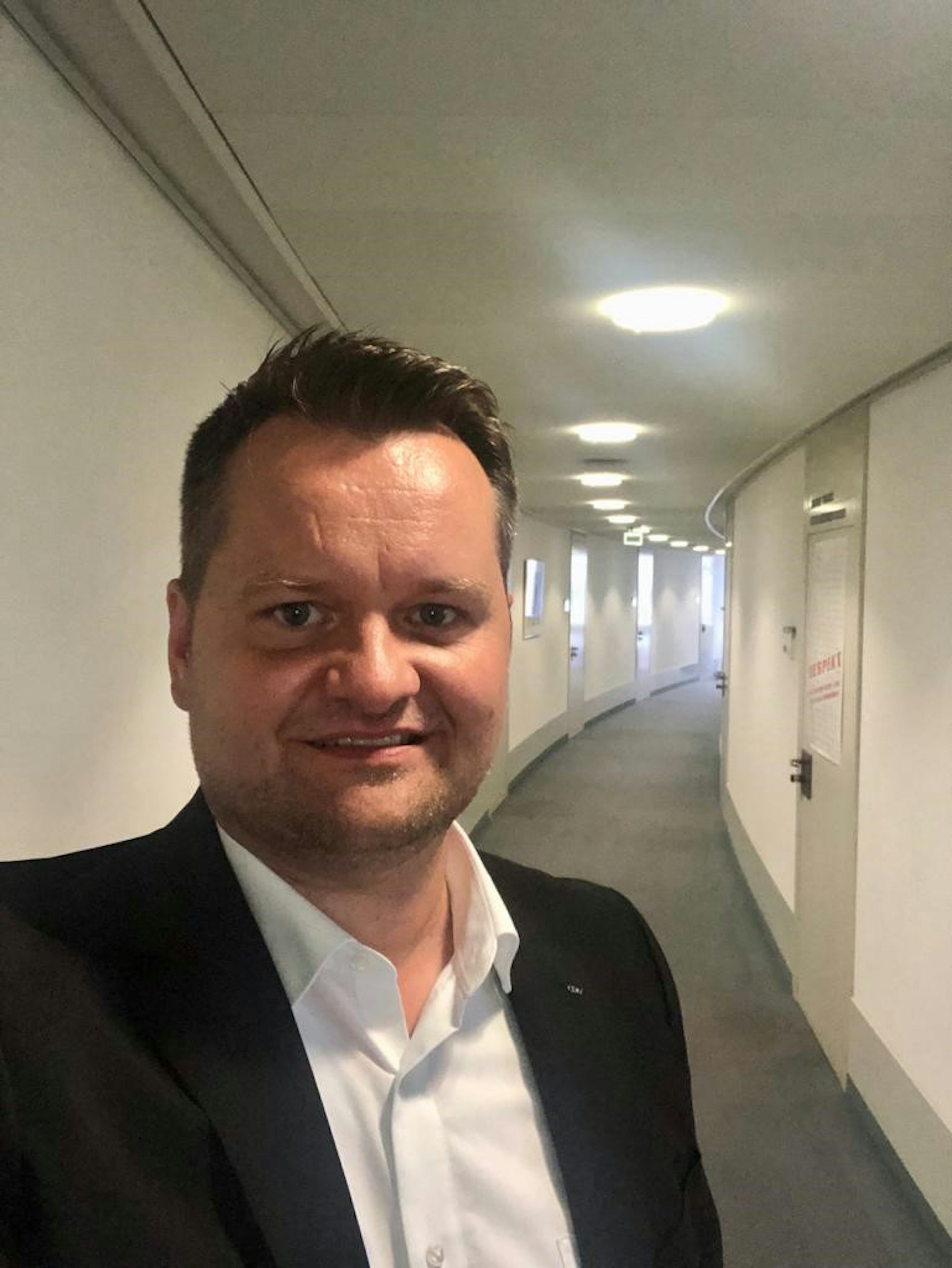 Christian Berger auf einem Flur des Landtaggebäudes in Düsseldorf.