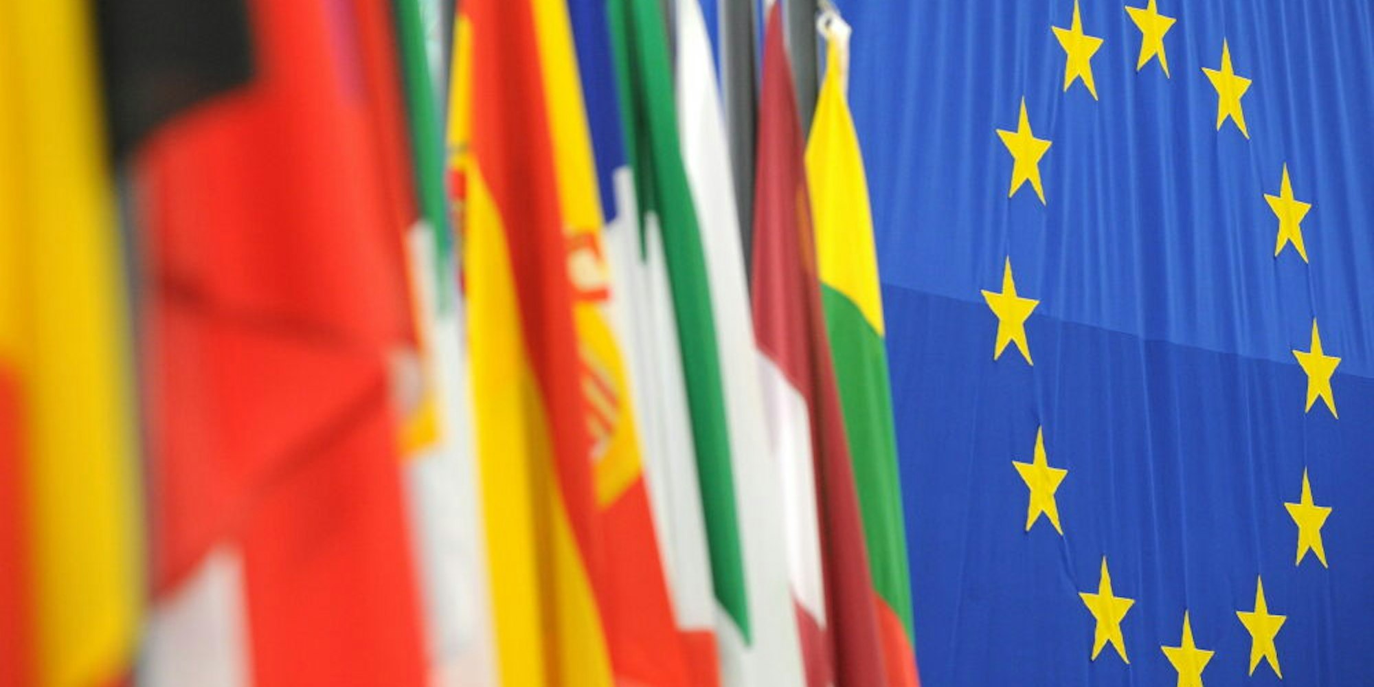 Flaggen der europäischen Mitgliedsstaaten im Europaparlament wehen in Straßburg