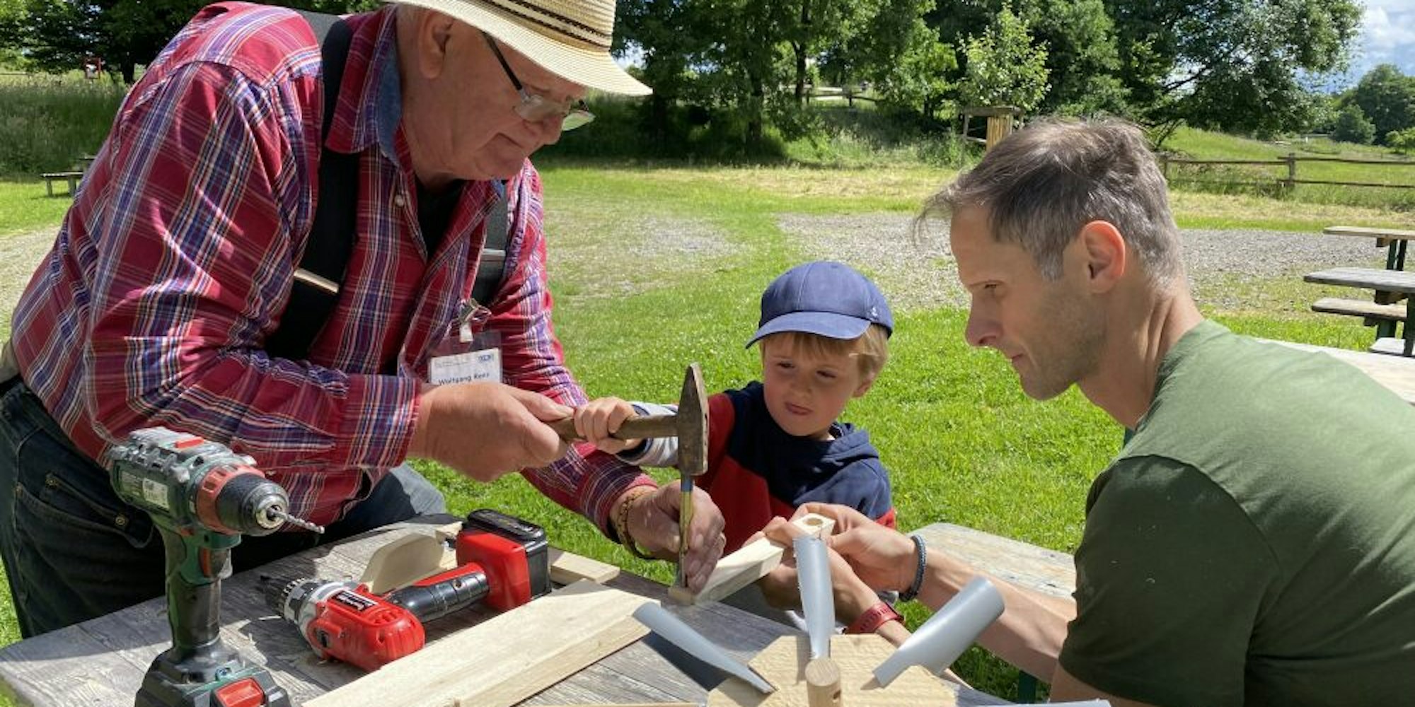 Das ließ sich der kleine Anton (vier Jahre) aus Drolshagen, der mit Papa Toni Papakrivos und Mama Heidi Kaderbach nach Lindlar gekommen war, nicht zweimal sagen. Nachdem er am Morgen schon seinen Bobbycar repariert hatte und seit dem Wochenende die selbst aufgebaute Matschküche steht, machte er sich eifrig an die Arbeit, ein Wasserrad zu bauen.