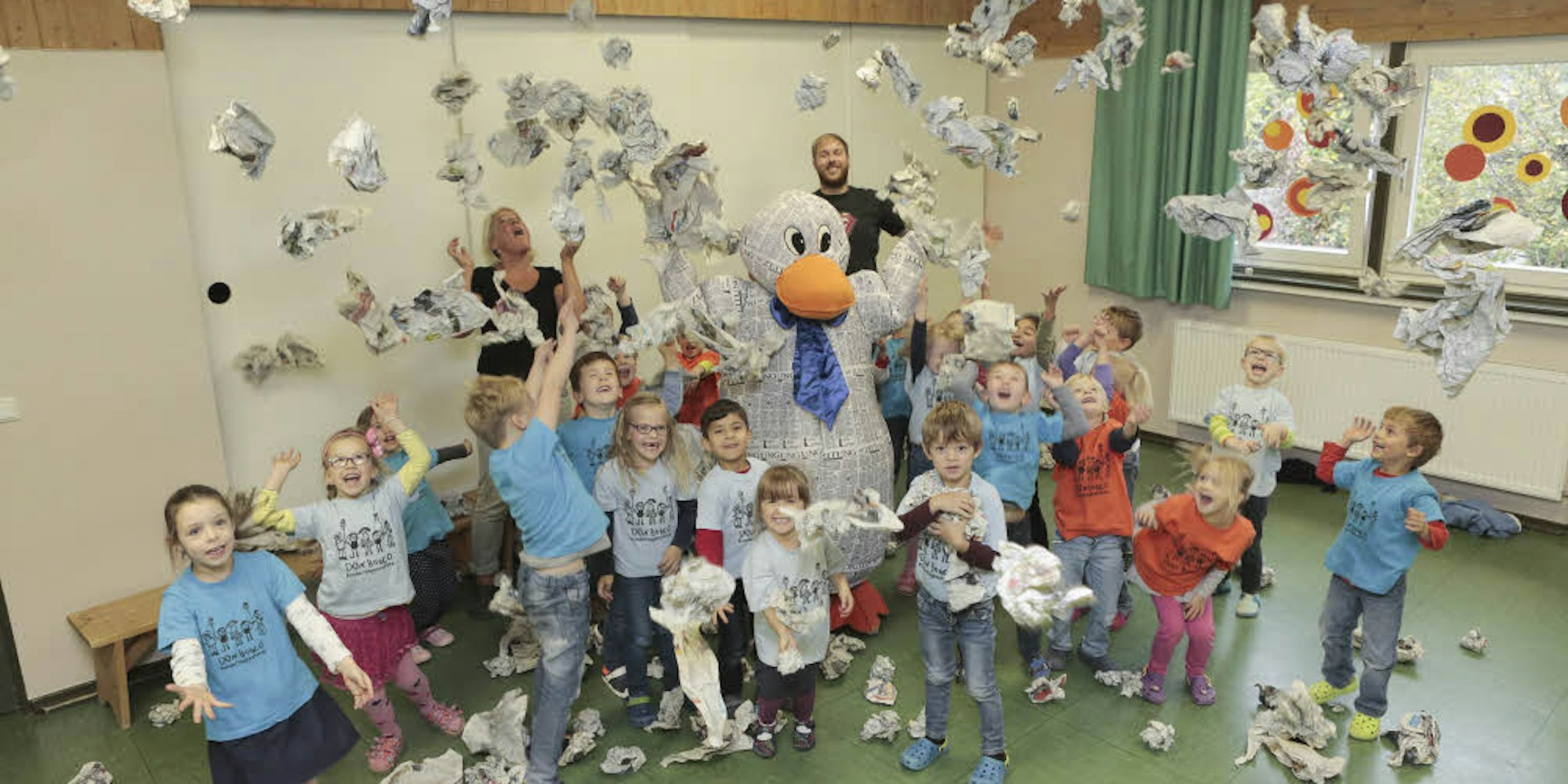 Zeitungsente Paula Print beim Besuch der Kita Don Bosco. Der Kindergarten braucht einen neuen Träger.