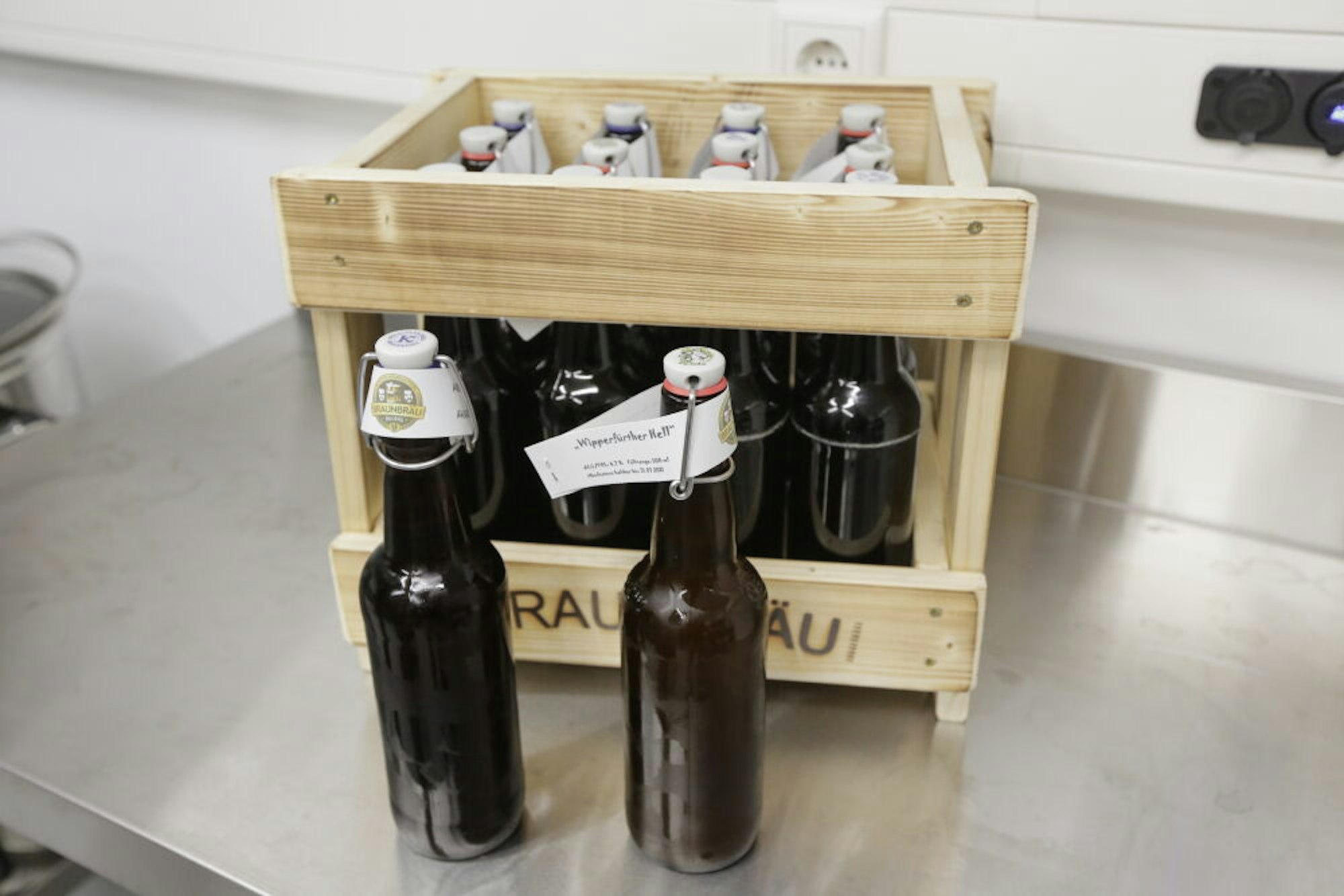 2021 könnte für Braunbräu ein entscheidendes Jahr werden: Die bisherigen 20-Liter-Fässer sollen der 30-Liter-Variante mit gastroüblichem Anschluss weichen. Um den Flaschenverkauf vorzubereiten, hat Benny Braun einen Geschirrspüler umgebaut, in dem 32 Bügelflaschen Platz finden, und etliche Holzrahmen zusammengeschraubt, die je zwölf Braunbräu-Pullen fassen.