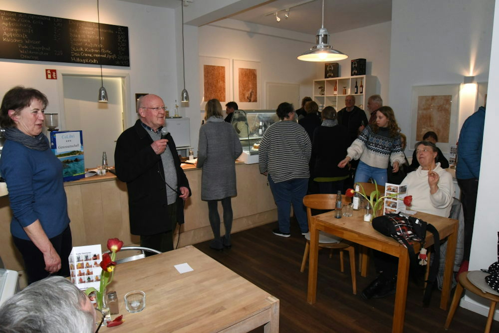 Franz-Josef Flosbach berichtet auf der Versammlung im Lenz Café und Deli über die Idee, eine Genossenschaft zu gründen.