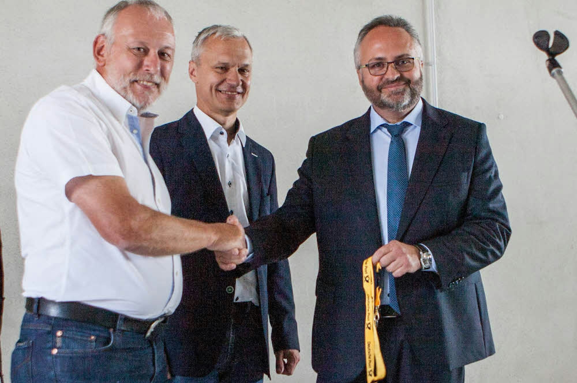 Schlüsselübergabe. Eigentümer Detlef Eggert (l.) überreicht den Schlüssel an Dirk Merz von der Post, in der Mitte Lindlars Bürgermeister Dr. Georg Ludwig, der bei der Vermietung vermittelte. Der Standort Gerberstraße liege sehr zentral, so Merz.