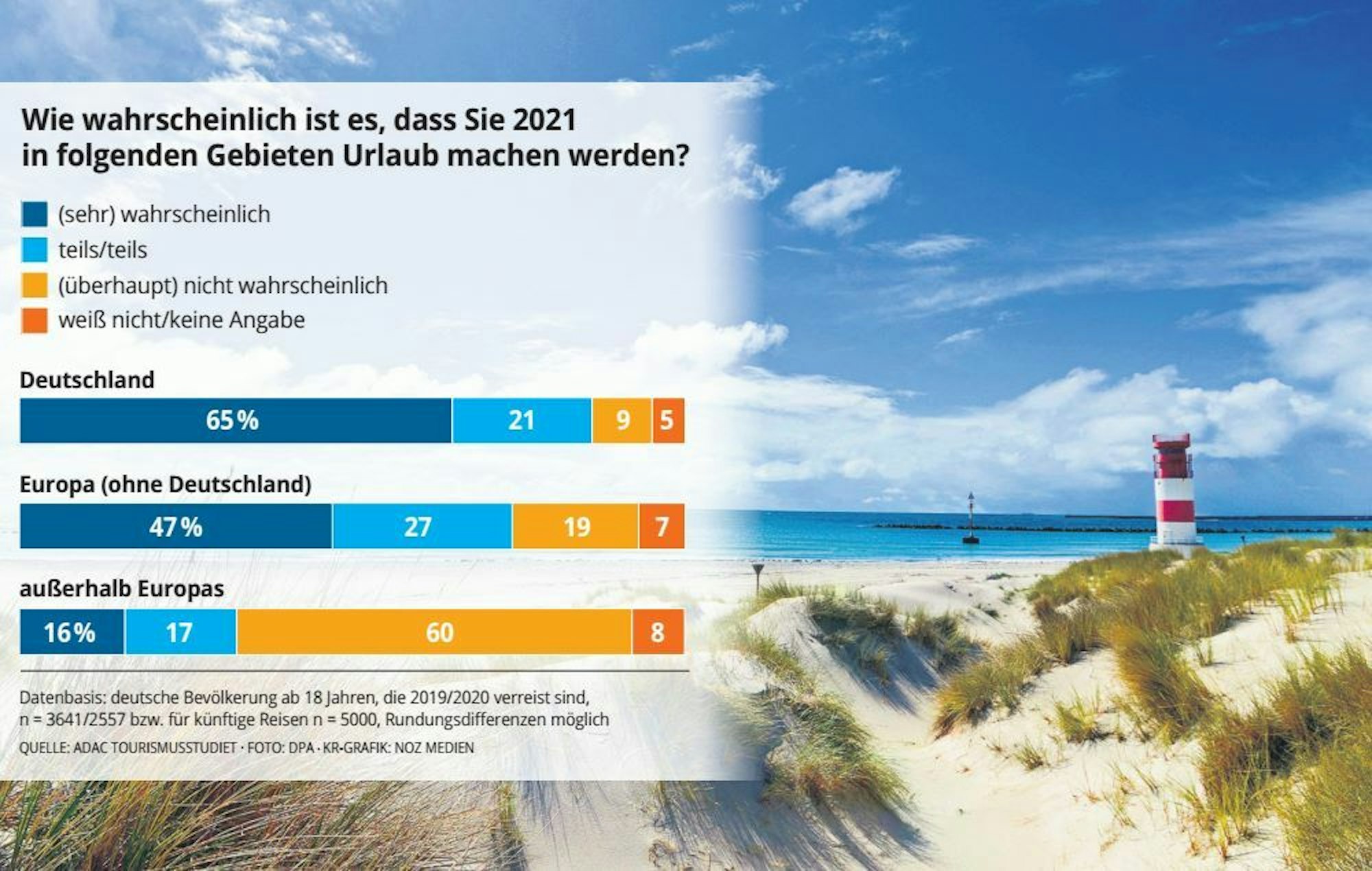 Was die Urlaubsplanung für 2021 angeht, bleibt eine gewisse Skepsis. Grundsätzlich wollen die Menschen reisen und auch wieder mehr Geld dafür ausgeben als im Vorjahr. Doch die Zurückhaltung wirkt sich vor allem darauf aus, dass die Menschen eher kurzfristig buchen wollen.
