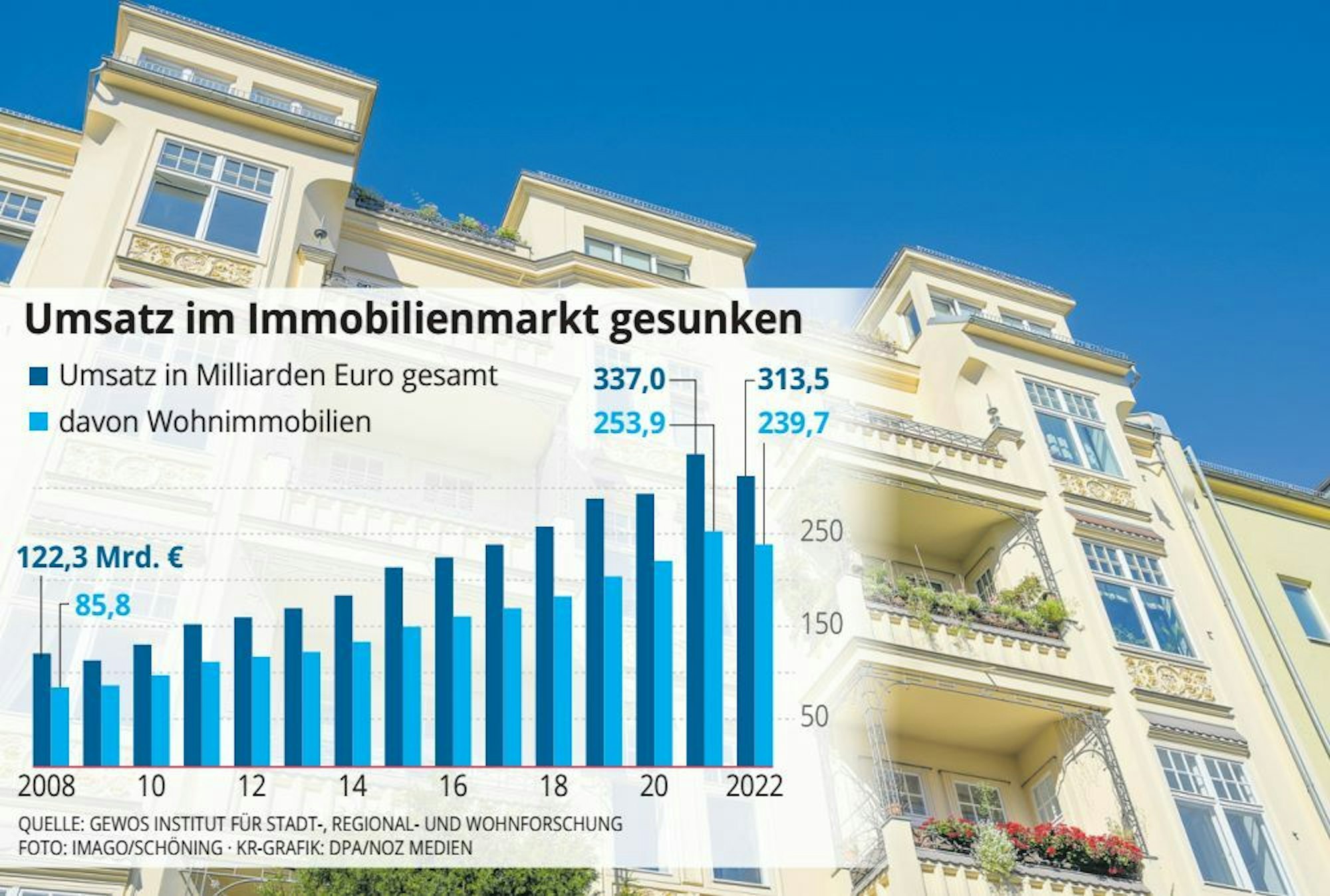 Der Immobilienkauf werde für Selbstnutzer immer schwieriger, da die Finanzierungskosten stiegen und die hohe Inflation die Kaufkraft schmälere. Investoren wiederum warteten aus Unsicherheit ab. Für die Studie hat Gewos Daten zu abgeschlossenen Grundstückkaufverträgen bei den Gutachterausschüssen und die damit verbundenen Umsätze analysiert.Etwas glimpflicher dürfte laut Gewos dieses Jahr der Markt für Wohnimmobilien davonkommen, der für fast 80 Prozent der Transaktionen hierzulande stehe. Der Umsatz mit Wohnungen und Häusern werde wohl um 5,6 Prozent auf knapp 240 Milliarden Euro sinken.