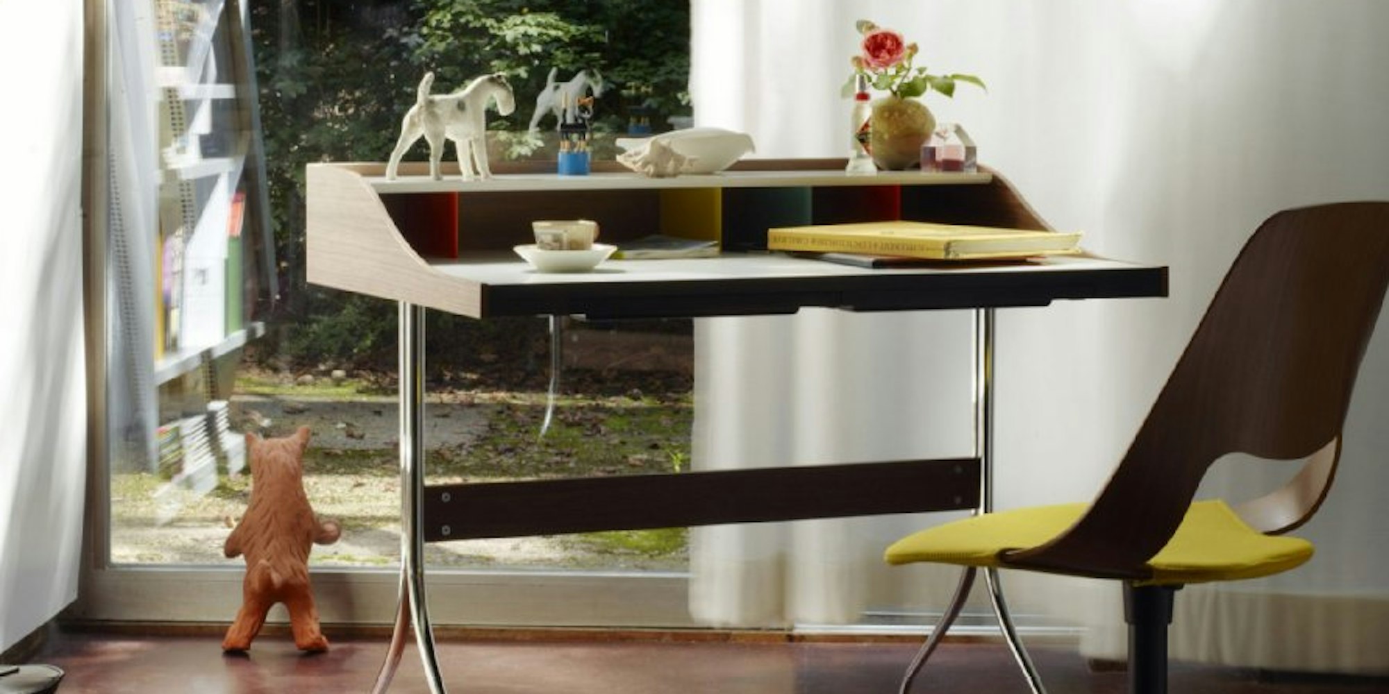 George Nelson, seinerzeit Designchef bei Herman Miller, hatte 1947 begonnen, das Büro in den Fokus der Kreativen zu rücken. Ein bis heute populärer Sekretär ist sein „Home Desk“ aus dem Jahr 1958, den Vitra produziert. Der Tisch zeichnet sich durch seine schlanke Silhouette und die geschwungenen Metallbeine aus.