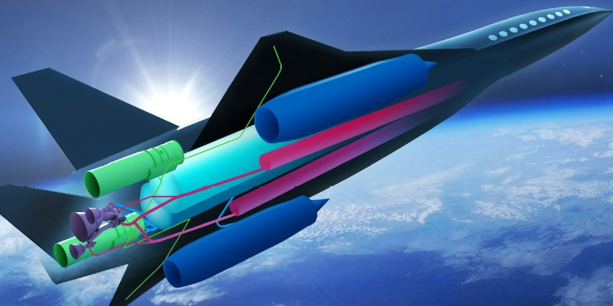 Zwei Leitwerke an den Enden der - ähnlich wie bei der Concorde - deltaförmigen Tragflächen werden in dieser Phase hochgeklappt. Dies soll mehr Schub und Stabilität bringen. Das Flugzeug soll so auf die 4,5-fache Schallgeschwindigkeit beschleunigen. Auf Reisehöhe übernehmen dann zwei spezielle Staustrahltriebwerke den Antrieb.