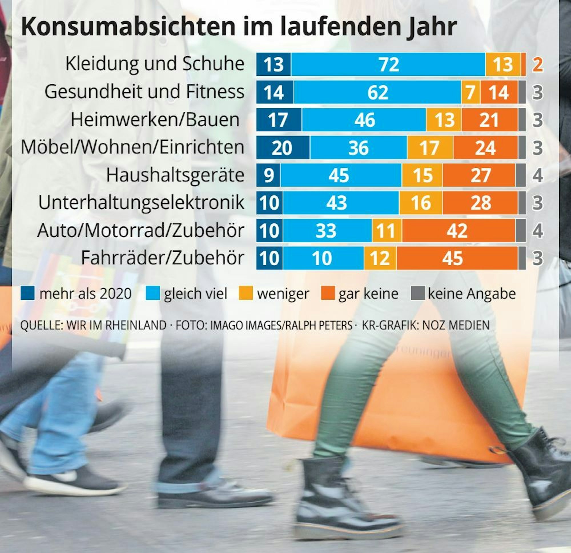 Begehrt sind im laufenden Jahr voraussichtlich auch Kleidung und Schuhe. 13 Prozent wollen dafür mehr Geld ausgeben, 72 Prozent genauso viel wie im Vorjahr (siehe Grafik S. 41). Gesundheit und Fitness stehen ebenfalls hoch im Kurs. Hier wollen 76 Prozent mehr oder gleich viel ausgeben wie 2019. Das kann ein Reflex auf eingeschränkte Sportmöglichkeiten in der Corona-Pandemie sein, in der etwa Fitness-Studios zumindest zeitweise geschlossen waren.