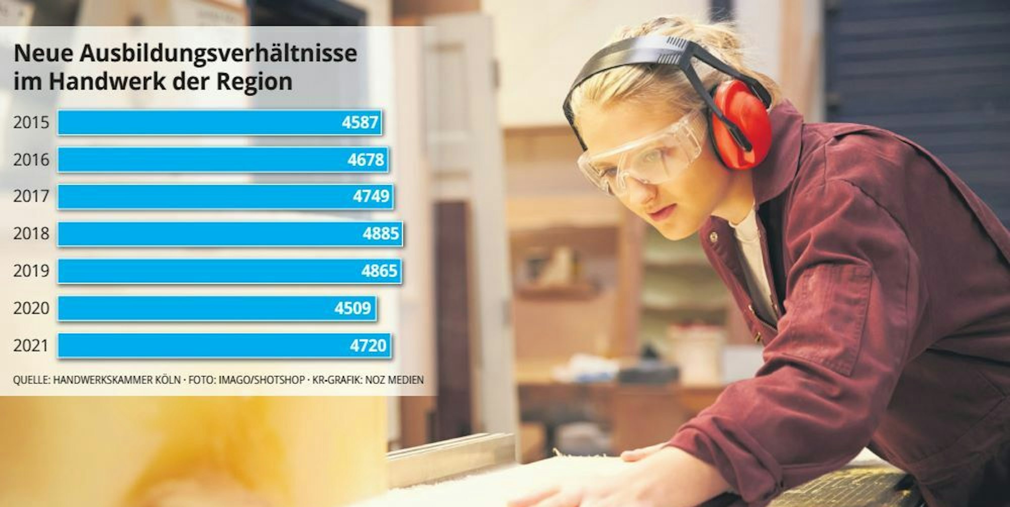 Die Zahl der neu abgeschlossenen Ausbildungsverträge stieg im Bereich der Handwerkskammer gegen den Bundestrend um 4,7 Prozent auf 4720 (siehe Grafik). Während es in Köln und Bonn nur geringe Veränderungen gab, verzeichnete der Rhein-Erft-Kreis ein Plus von 16,5 Prozent und der Rhein-Sieg-Kreis ein Plus von 8,9 Prozent.