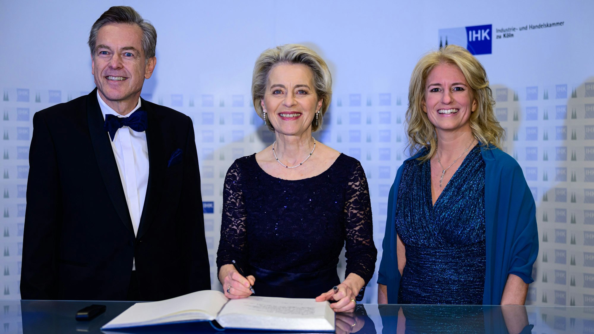 EU-Kommissionspräsidentin Ursula von der Leyen trägt sich eingerahmt von IHK-Hauptgeschäftsführer Uwe Vetterlein und IHK-Präsidentin Nicole Grünewald in das Goldene Buch der Kölner Kammer ein.