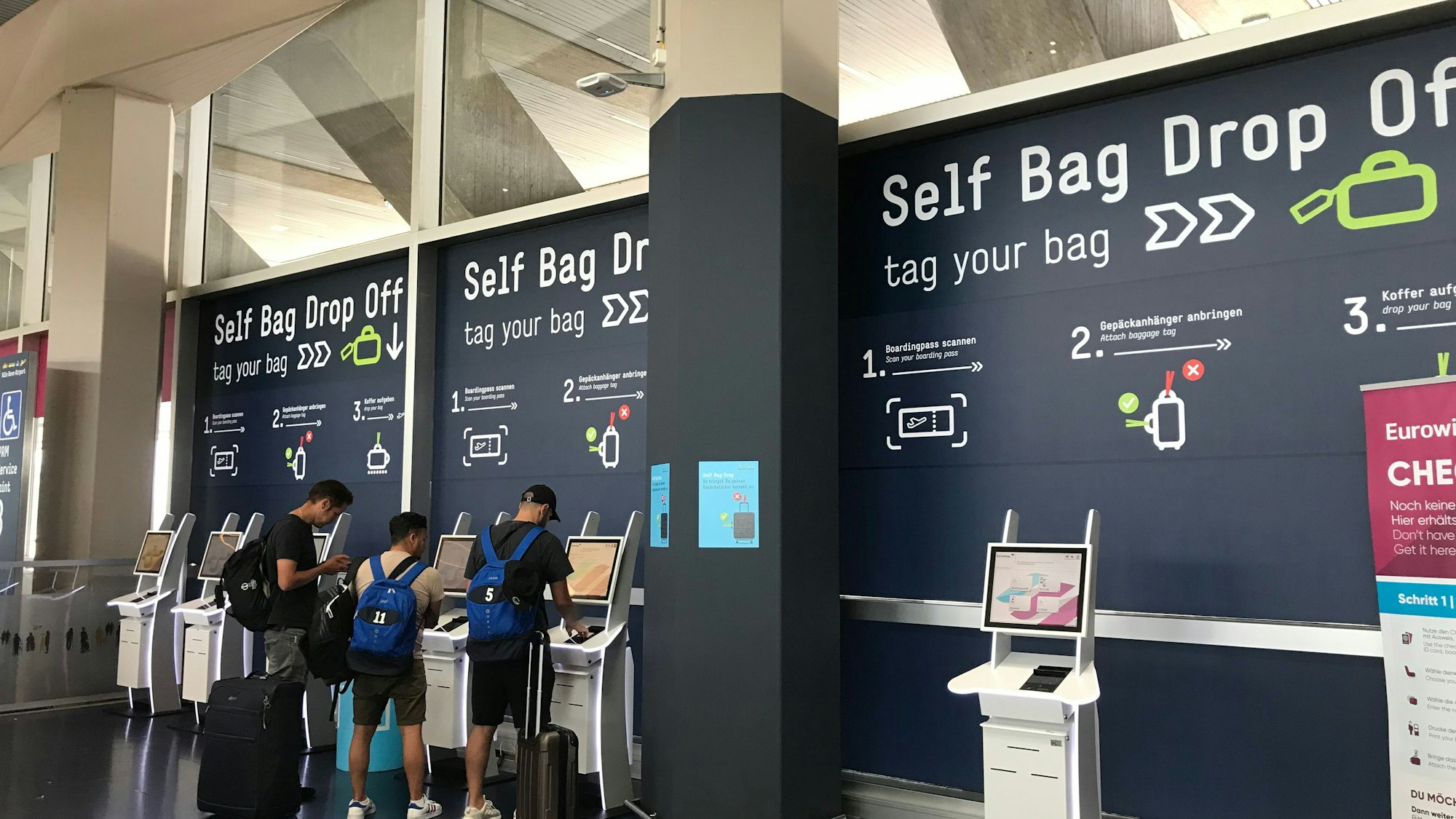 Am Flughafen Köln/ Bonn nutzen Passagiere einen Automaten zur Gepäckaufgabe.