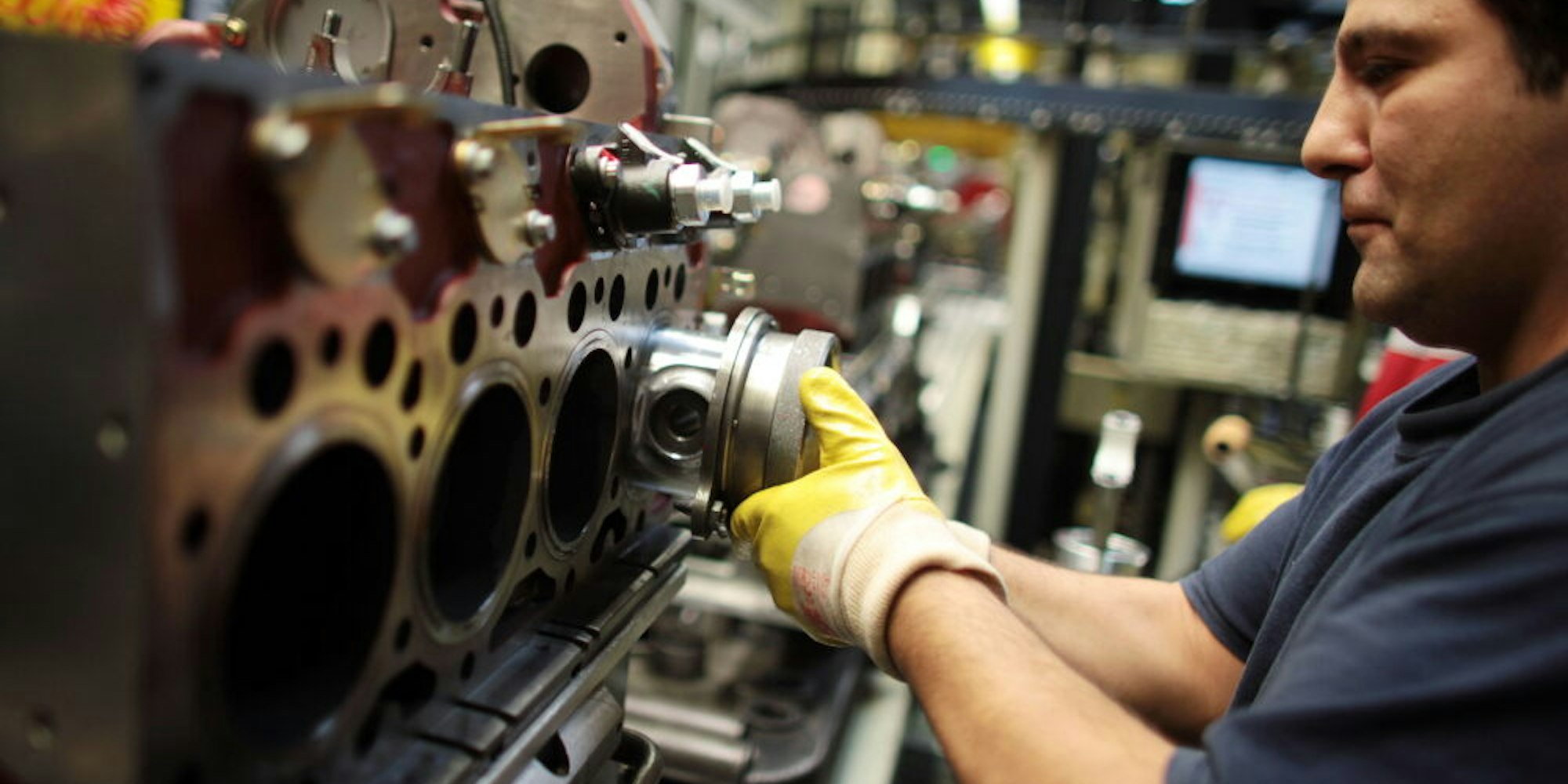 Ein Deutz-Mitarbeiter schiebt einen Kolben in einen Motorblock.