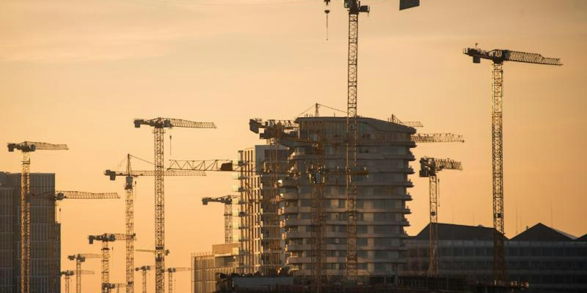Die Sonne leuchtet am Morgen in der HafenCity Gebäude und Baukräne an.