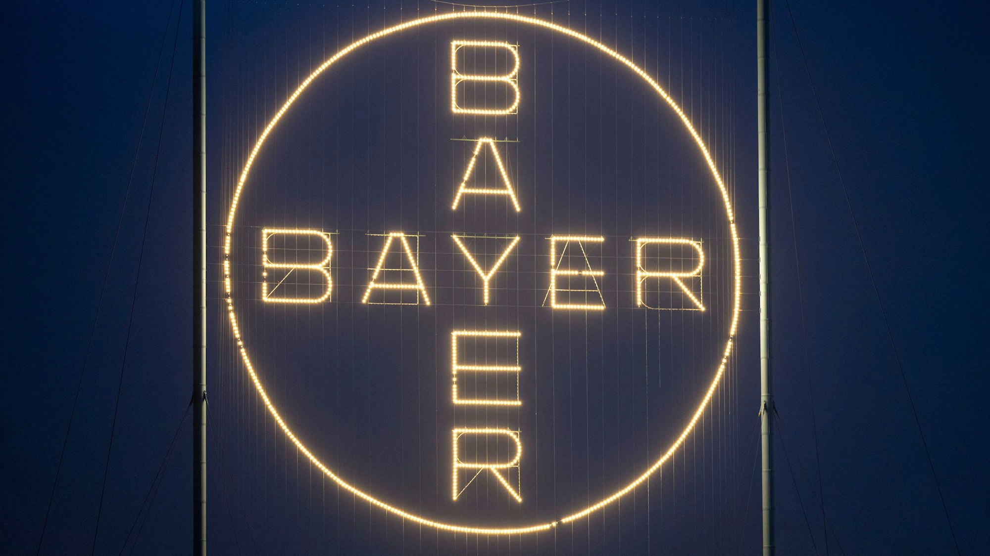 Das Bayer-Logo leuchtet auf dem Werksgelände des Konzerns in Leverkusen.