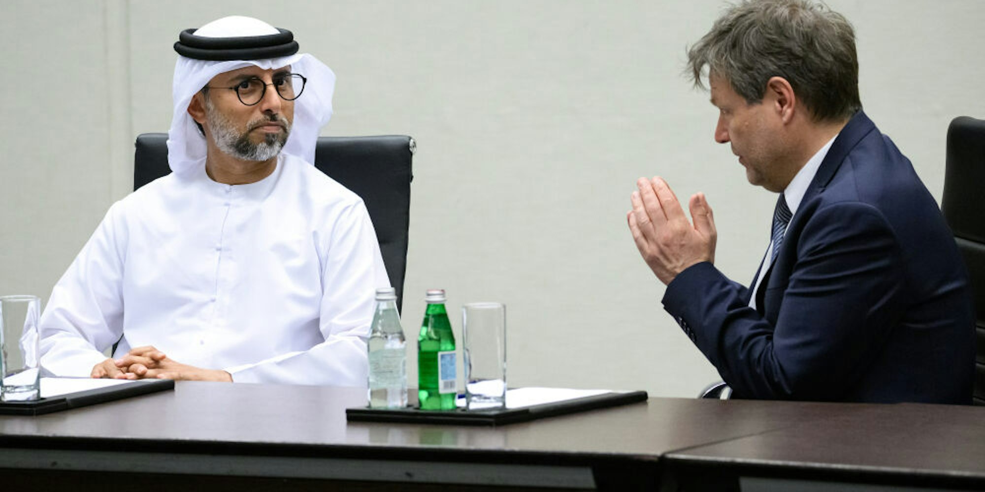 Robert Habeck (rechts, Grüne) bei seinem Besuch bei dem Energiemister der Vereinigten Arabischen Emirate, Suhail al-Masrui.