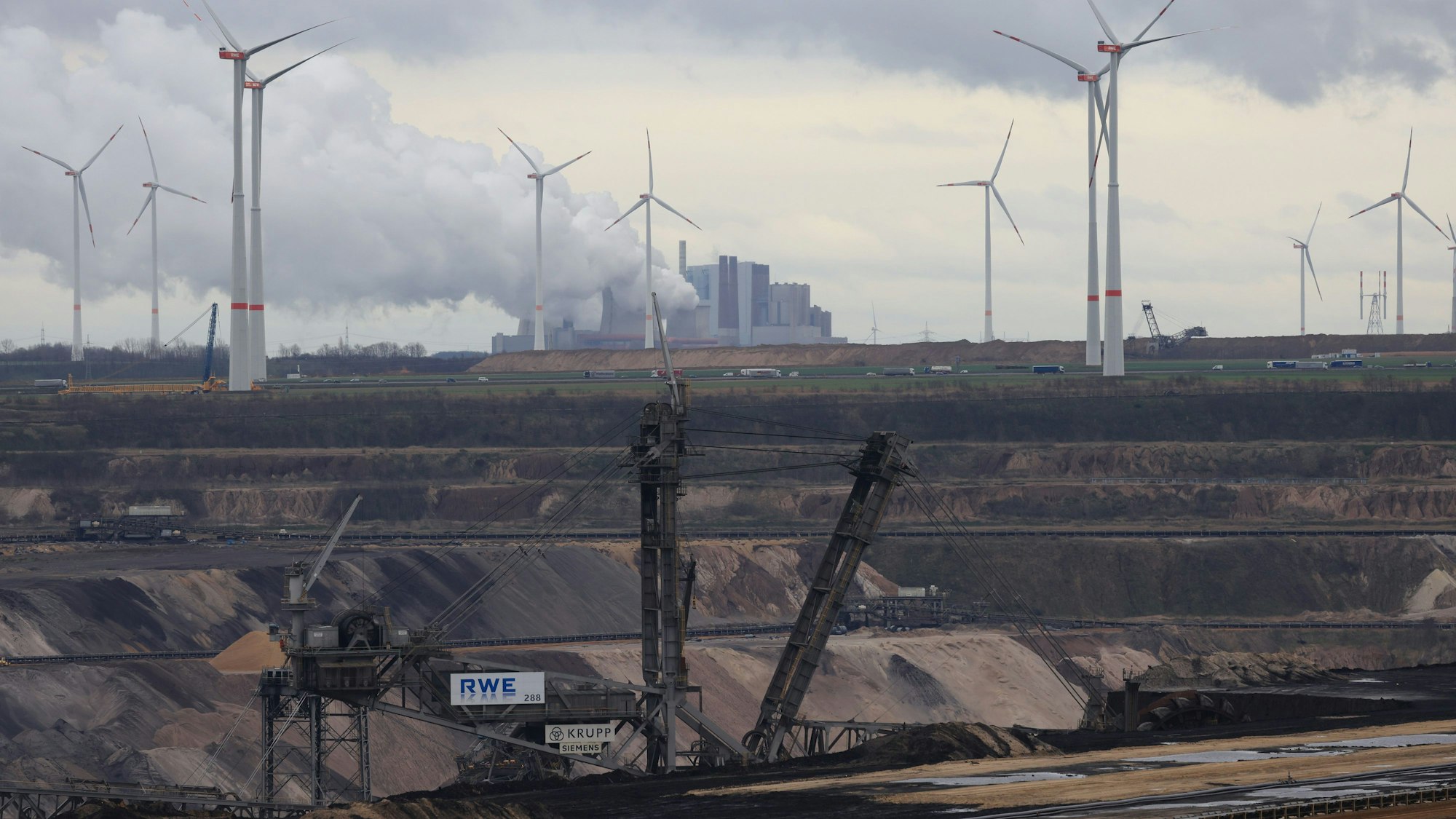 Windräder und Braunkohlekraftwerk am Tagebau Garzweiler. Bei den Erneuerbaren kann RWE den Gewinn steigern.
