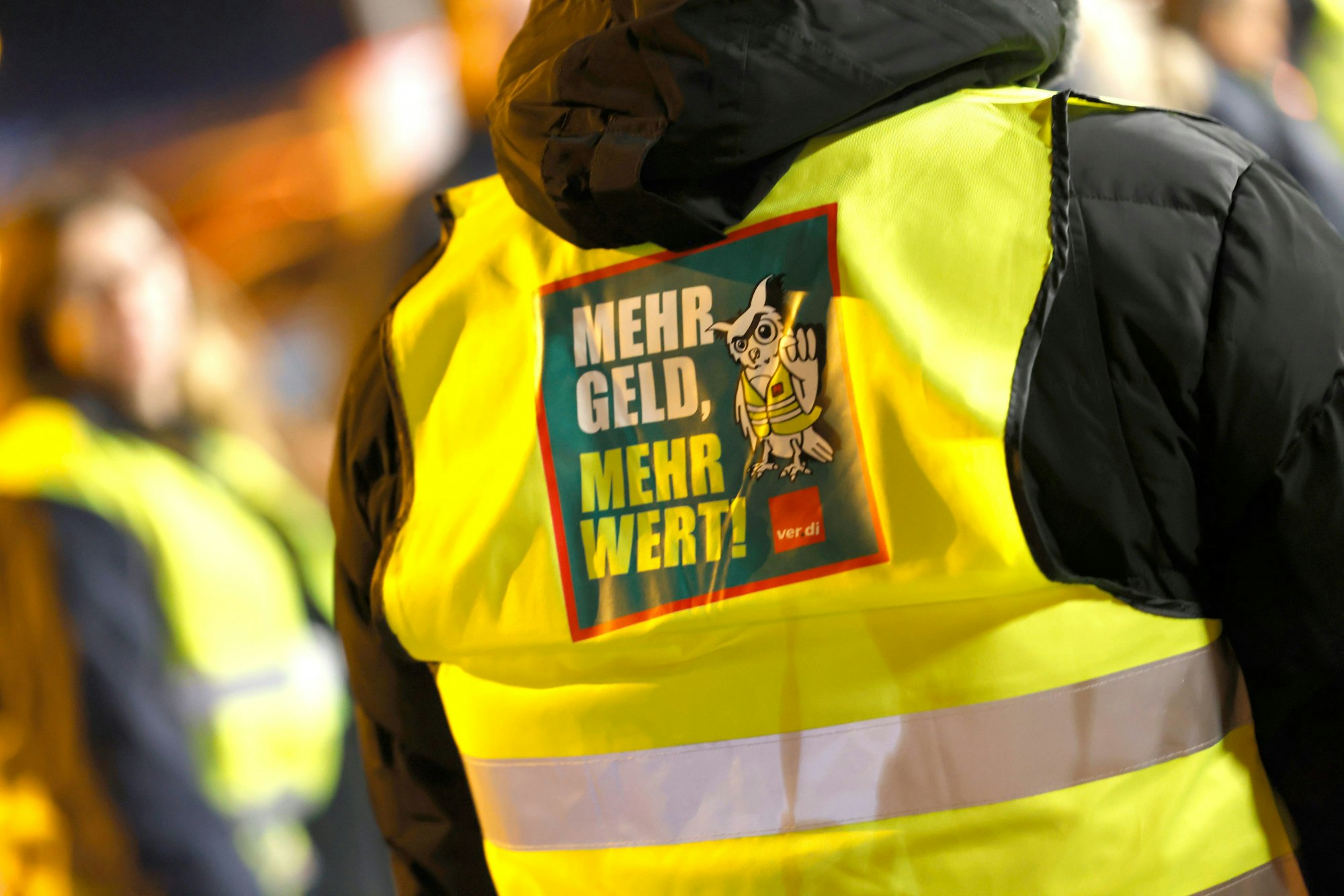 Ein Streikender am Flughafen Köln/Bonn trägt eine gelbe Weste mit der Aussage: "Mehr Geld, mehr Wert!"