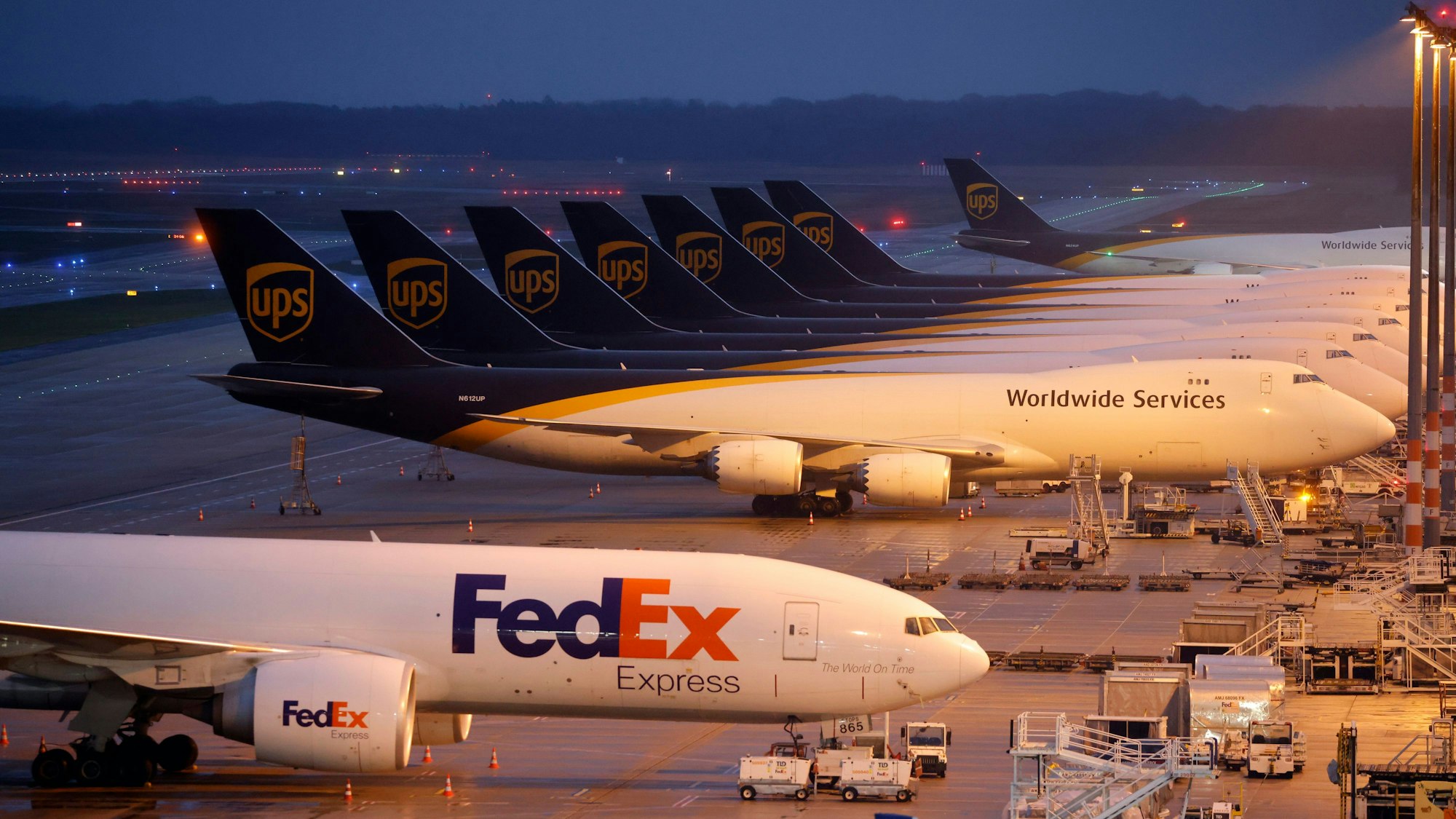 Frachtmaschinen stehen am Flughafen Köln/Bonn nebeneinander und werden in der Nacht zum Weiterflug beladen.