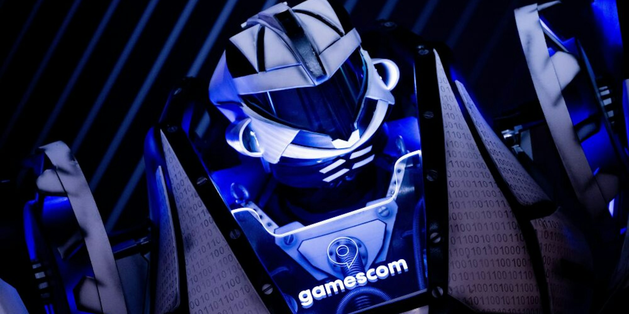 Der Gamesbot, ein übermenschlich großer Roboter mit dem Logo der Gamescom, kann in einer Woche wieder Messebesucher vor Ort begrüßen.